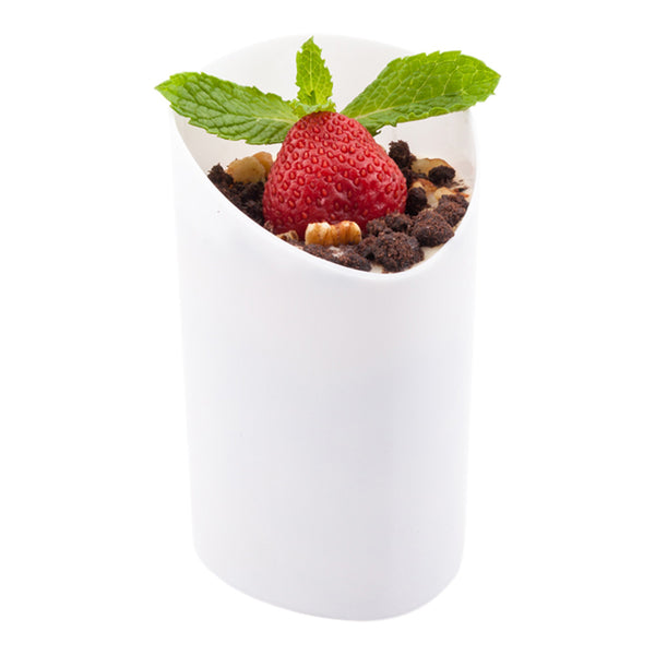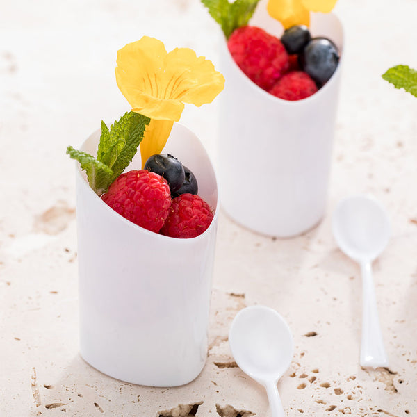 Bring an air of sophistication and refinement to any dining setting and tablescape with our Mini Serve 3-ounce White Plastic Triangolo Shot Glasses with Silver Plastic Mini Forks. Manufactured from high-quality plastic, these shot glasses are durable and sturdy, ideal for serving yogurts, nuts, sundaes, parfaits, and fruit salads. These dessert cups have a unique, modern design with a classic white finish to complement all tablescapes. Holding up to 3 ounces, these white cups are ideal for serving miniature-sized desserts or appetizers. These plastic forks feature a shiny silver finish designed to effortlessly enhance the presentation of your tantalizing dishes. With strong and sturdy handles, these cake forks are built to stand up to hefty bites of polenta and big scoops of gelato. These appetizer cups and tasting forks are conveniently disposable, offering a straightforward cleaning experience after large events. Measuring 1.75 inches long by 1.75 inches wide by 3 inches tall, these plastic shot glasses have a capacity of 3 ounces, while the mini forks measure 4 inches long. Each order includes 100 glasses and 100 forks.