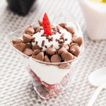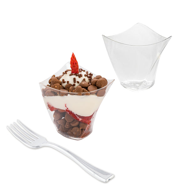 Serve your delectable delights in style with our Mini Serve 4-ounce Clear Plastic Mini Crescendo Cups with Silver Plastic Mini Forks. Crafted from high-quality plastic, these clear cups cups and cake forks are disposable, offering the ultimate convenience of easy cleanup after any gathering. Featuring an innovative twisted geometric design and crystal-clear finish, these dessert cups beautifully showcase layered mousses, fruit parfaits, ceviches and more while adding a sophisticated touch to any occasion. These tasting forks have a shiny silver finish with sturdy handle that are perfect for scooping up hefty bites of polenta and gelato. With a capacity of 4 ounces, these parfait cups are perfect for serving single portions of culinary delights. These disposable measure 3 inches in length by 3 inches in width by 2.75 inches in height and have a capacity of 4 ounces, while the included plastic forks measure 4 inches in length. Each order includes 100 cups and 100 forks.