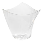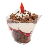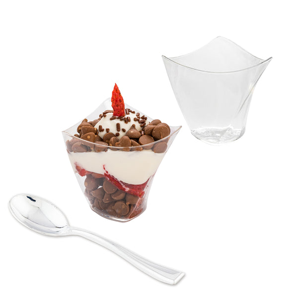 Elevate your culinary presentations with our Bundle: Mini Serve 100 4-ounce Clear Plastic Mini Crescendo Cups with 100 Silver Plastic 4-inch Mini Spoons. This bundle includes cups and spoons, providing a complete solution for plating miniature delights. Made from premium plastic, these appetizer cups and spoons are durable and do not crack or warp easily for reliable use. These clear plastic cups feature a twisted geometric design, lending an elegant touch to layered mousses, fruit parfaits, or ceviches. The shiny silver finish of these plastic spoons effortlessly enhance the presentation of tantalizing bites, from miniature tuna tartare to personal-sized strawberry shortcakes. These 4-inch spoons have sturdy handles and stand up to hefty scoops of polenta or gelato. Designed for convenience, these disposable cups and spoons can be discarded after for an easy cleanup. These dessert cups measure 3 inches in diameter by 2.75 inches in height and hold 4 ounces. Each order includes 100 cups and 100 spoons.