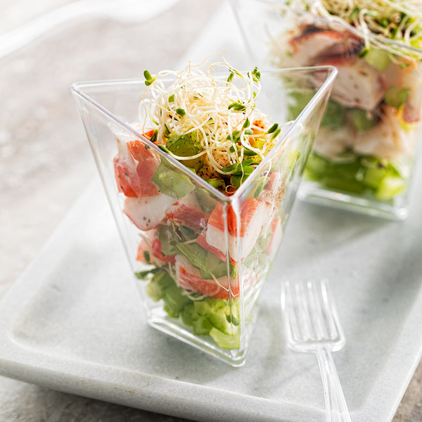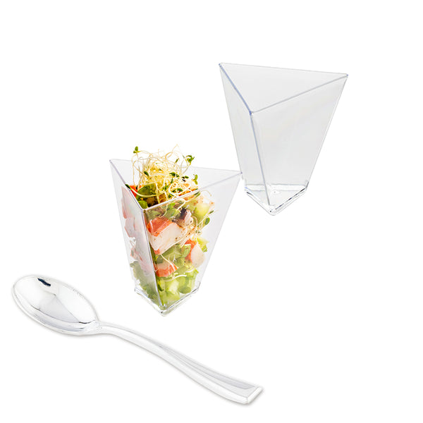 Elevate your culinary presentations with our Bundle: Mini Serve 100 4-ounce Clear Plastic Torcente Dessert Cups with 100 Silver Plastic 4-inch Mini Spoons, offering a chic solution for serving individual portions. This bundle includes dessert cups and mini spoons, both designed to enhance the visual appeal of your bite-sized offerings. The triangular design of these plastic cups provides a modern touch to your presentation. The clear finish of these appetizer cups gives a suave edge to your food presentation, while the disposable nature ensures effortless cleaning. These plastic spoons with a shiny silver finish, are meticulously designed to effortlessly elevate the presentation of your tantalizing dishes, from miniature tuna tartare to personal-sized strawberry shortcakes. With sturdy handles, these 4-inch spoons can stand up to hefty bites of polenta and big scoops of gelato. Ideal for easy cleanup, these disposable cups and spoons can be discarded after use. These cups measure 3 inches in length by 2.5 inches in width by 2.75 inches in height and have a capacity of 4 ounces. Each order includes 100 cups and 100 spoons.