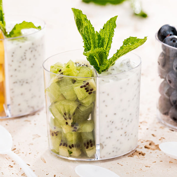 Host a modern event with our Bundle: Mini Serve 100 4-ounce Oval Clear Plastic Duet Tasting Cups with 100 Silver Plastic 4-inch Mini Spoons. This bundle includes 4-ounce oval clear plastic duet tasting cups and silver plastic mini spoons. These tasting cups ensure a smooth dining experience with their sleek rim design. These confection cups feature an oval shape with two compartments, allowing you to serve different desserts or appetizers simultaneously, while their clear design showcases the vibrant colors of your culinary creations. With a 4-ounce capacity and two compartments, these disposable party cups are perfect for pairing appetizers, desserts, or drinks. These silver plastic mini spoons measure 4 inches in length and effortlessly enhance the presentation of your tantalizing dishes with their shiny silver finish. Plus, these sturdy spoons can handle hefty bites, making them ideal for serving polenta, gelato, or miniature tuna tartare. Measuring 2.5 inches in length by 1.75 inches in width by 2.5 inches in height, these plastic duet tasting cups are ideal for your appetizer presentation. These spoons are 4 inches long to scoop the perfect bites. Each order includes 100 tasting cups and 100 mini spoons.