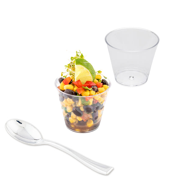 Elevate your dessert presentation with our Bundle: Mini Serve 100 4-ounce Round Clear Plastic Arco Dessert Cups with 100 Silver Plastic 4-inch Mini Spoons, offering a stylish and convenient solution for serving individual treats. This bundle includes transparent plastic dessert cups that showcase the vibrant colors and fresh ingredients of your delectable creations, attracting customers' attention. Crafted from durable plastic, these appetizer cups and spoons do not crack or warp easily. The classic round design of these plastic cups provides a comfortable hold, avoiding accidental spills at your bakery, restaurant, or catered event. With a shiny silver finish, these plastic spoons are designed to effortlessly enhance the presentation of your tantalizing dishes. These 4-inch spoons are the ideal size for accompanying miniature tuna tartare, personal-sized strawberry shortcakes. With sturdy handles, these mini spoons are ideal for scooping up hefty bites of polenta and gelato. For an easy cleanup, these disposable cups and spoons can be discarded after use. These dessert cups measure 2.5 inches in diameter by 2.25 inches in height and can hold up to 4 ounces. Each order includes 100 cups and 100 spoons.