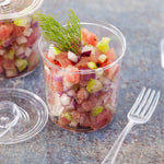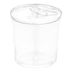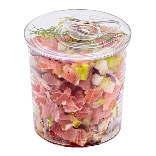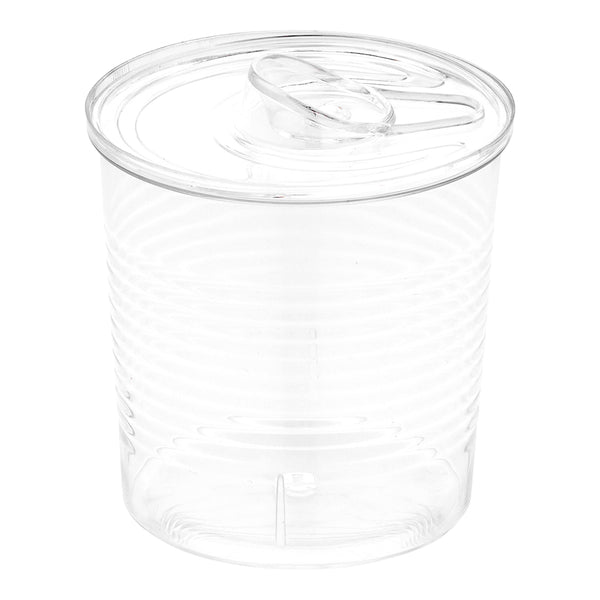 Serve up delectable appetizers in style with our Mini Serve 4-ounce Round Clear Plastic Tin Cans with Silver Plastic Mini Forks. Crafted from premium plastic, these appetizer bowls and cake forks make them durable and ideal for serving cold food. These food tin cans have a classic round design with ridges that mimic traditional tin cans, allowing foodservice establishments to plate foods in a stylish yet fun way. Featuring tight-fitting lids, these take out containers can beautifully showcase your culinary creations while avoiding messy spills. These disposable food containers, when paired with the included silver plastic forks, elevate your table setting and effortlessly enhance the presentation of seafood-stuffed appetizers, creamy polenta, or fruity gelato. The sturdy handles and prong of these 4-inch forks make them ideal for spearing hefty morsel. For a swift cleanup after eating, these clear plastic containers and dessert forks are disposable. These round containers measure 2.5 inches in diameter by 2.75 inches in height and can hold up to 4 ounces, while the plastic forks measure 4 inches in length. Each order includes 100 tin cans and 100 forks.