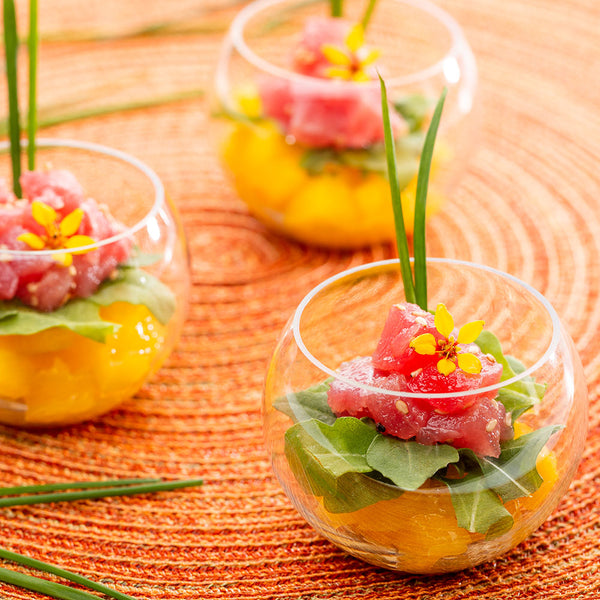 Elevate your dessert game with our Mini Serve 4-ounce Sphere Clear Plastic Cups with Silver Plastic Mini Forks. Made from high-quality plastic, these dessert cups and cake forks are disposable, ideal for an easy cleanup. In this bundle, these appetizer cups have a sleek square shape, and the disposable forks have a shimmering silver finish, providing an elegant serving solution for any catered event. These clear plastic cups feature a chic sphere form for an attractive, sophisticated presentation of appetizers, desserts and more. With a capacity of 4 ounces, these disposable cups are perfect for holding single serving of mousse, tarts, or ceviches. The sturdy build of these dessert forks are ideal for spearing polenta, slicing into strawberry shortcakes or scooping generous portions of gelato. These sphere cups measure 2.75 inches in diameter by 2.25 inches in height, while the included plastic forks measure 4 inches in length. Each order includes 100 cups and 100 forks.