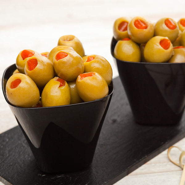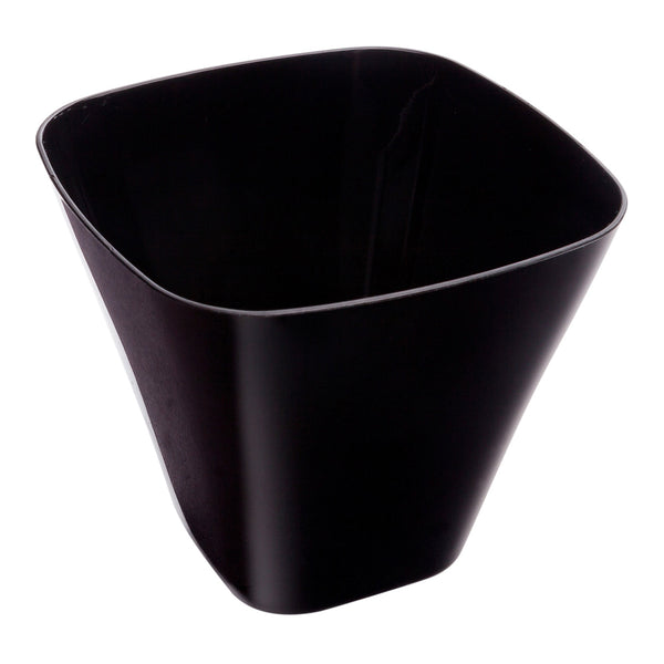 Serve up delectable hors d'oeuvres and miniature desserts in sophisticated style with our Mini Serve 4-ounce Square Black Plastic Bellissima Tasting Cups with Silver Plastic Mini Forks. With a sleek black finish and sturdy construction, these square cups have a capacity of 4 ounces and stylishly showcase your bite-sized appetizers and individually portioned pastries. The premium plastic construction of these appetizer cups and cake forks makes them conveniently disposable for an easy cleanup after a large social gathering. Each plastic fork features shiny silver handles that effortlessly elevate your table presentation while the strong and sturdy construction allows guests to enjoy hearty bites of their favorite dishes. These black cups measure 2.5 inches long by 2.5 inches wide by 2.25 inches tall and have a capacity of 4 ounces, while the included mini forks measure 4 inches long. Each order includes 100 cups and 100 forks.