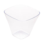 Impress your guests with a memorable fine dining experience using our Mini Serve 4-ounce Square Clear Plastic Bellissima Tasting Cups with Silver Plastic Mini Forks. Featuring a crystal clear finish, these appetizer cups allow you to artfully showcase vibrant sauces and garnishes. Constructed from durable plastic, these tasting cups and cake forks are conveniently disposable while still able to withstand hearty portions of decadent desserts. The sleek square shape and tapered sides of these clear cups provide an elegant canvas for your culinary masterpieces while still allowing for a comfortable grip. Holding up to 4 ounces, these serving cups are perfect for serving small portions of desserts or appetizers. Paired with shiny silver tasting forks, this bundle elevates your table setting to new heights of sophistication. With strong and sturdy handles, these plastic forks can stand up to robust bites of short rib or scoops of lemon gelato. These square cups measure 2.5 inches long by 2.5 inches wide by 2.25 inches tall and have a capacity of 4 ounces, while the included mini forks measure 4 inches long. Each order includes 100 cups and 100 forks.