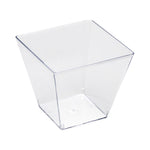 Elevate your dessert presentations with our Bundle: Mini Serve 100 4-ounce Square Clear Plastic Small Kova Cups with 100 Silver Plastic 4-inch Mini Spoons. This bundle includes cups and spoons, providing all the necessary components for stunning individual desserts and appetizers. The square design of these plastic cups adds sophistication to your ice cream, chocolate mousse, and parfait servings. With a crystal-clear finish, these appetizer cups showcases the layers for an appetizing display. Crafted from premium plastic, these cups and spoons are durable and do not break or warp easily. The shiny silver finish of these plastic spoons enhance the presentation of your dishes. With their sturdy handles, these 4-inch spoons can handle hefty bites of polenta or big scoops of gelato, making them ideal for miniature tuna tartare or personal-sized strawberry shortcakes. For swift cleanup, these disposable cups and spoons can be discarded after use for an easy cleanup. These dessert cups measure 2.25 inches in length by 2.5 inches in width by 2 inches in height and can hold up to 4 ounces. Each order includes 100 cups and 100 spoons.
