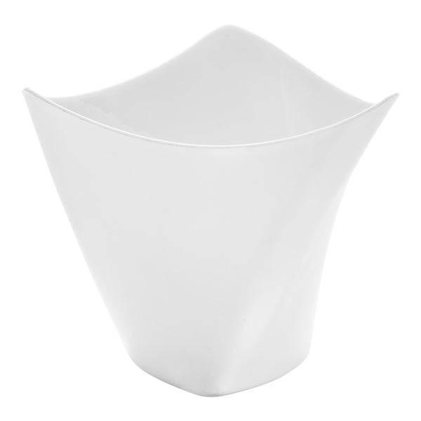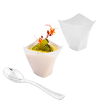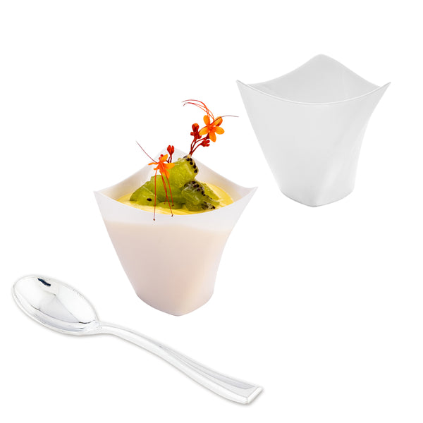 Elevate your culinary presentations with our Bundle: Mini Serve 100 4-ounce White Plastic Mini Crescendo Cups with 100 Silver Plastic 4-inch Mini Spoons. This bundle includes elegant white plastic dessert cups and spoons for a comprehensive dining experience. Crafted from premium plastic, these cups and spoons do not crack or warp easily. Featuring a unique geometric design with a sleek triangular rim, these appetizer cups create a sophisticated backdrop for bite-sized treats. The polished white finish of the plastic cups provides a striking contrast for your miniature chocolate mousses, fruit parfaits, or ceviches. These plastic spoons have a shiny silver finish that effortlessly enhances the presentation of tantalizing dishes. The sturdy handle of these 4-inch spoons can handle hefty bites of polenta or big scoops of gelato. To provide a swift cleanup, these disposable cups and spoons can be discarded after use. These dessert cups measure 3 inches in diameter by 2.75 inches in height and can hold up to 4 ounces. Each order includes 100 cups and 100 spoons.