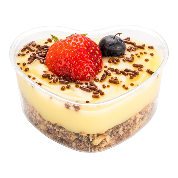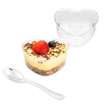 Elevate your culinary presentations with our Bundle: Mini Serve 100 5-ounce Clear Plastic Mini Heart Cups with 100 Silver Plastic 4-inch Mini Spoons, a delightfully charming set perfect for serving miniature delicacies. This bundle includes elegant heart-shaped cups and sleek silver plastic mini spoons, allowing you to create a cohesive and visually appealing display. Crafted from premium plastic, these appetizer cups and spoons are durable and do not break or warp easily. The crystal-clear finish of these dessert cups beautifully showcases the delectable confections inside, and raised sides expertly contain any messy glazes or sauces. These plastic spoons have a shiny silver finish and are designed to effortlessly enhance the presentation of your tantalizing dishes. The sturdy handles of these 4-inch spoons are perfect for scooping up hefty bites of polenta or gelato. These heart cups measure 3.25 inches long by 3 inches wide by 1.5 inches tall and can hold up to 5 ounces. Each order includes 100 cups and 100 spoons.