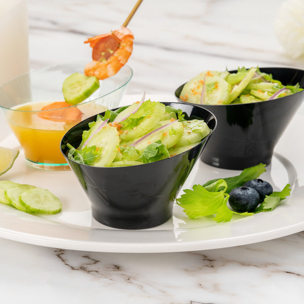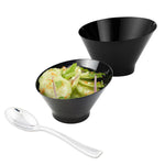 Elevate your culinary presentations with our Bundle: Mini Serve 100 5-ounce Round Black Plastic Small Incline Bowls with 100 Silver Plastic 4-inch Mini Spoons. This bundle includes our stylish black incline bowls and sleek silver plastic mini spoons designed to enhance your tantalizing dishes. Crafted from premium plastic, these serving bowls and spoons are durable and do not warp or crack easily for reliable performance. The glossy black finish and inclined shape of these food bowls add an elegant touch to appetizer and dessert tables. With a shiny silver finish, these plastic spoons effortlessly complement the bowls, elevating the presentation with their eye-catching finish. These 4-inch spoons have a sturdy handle and can withstand hefty bites of your culinary creations. For a quick and easy cleanup, these serving dishes and spoons are disposable and can be discarded after use. These plastic serving bowls measure 3.75 inches in diameter by 2.5 inches in height and can hold up to 5 ounces. Each order includes 100 bowls and 100 spoons.