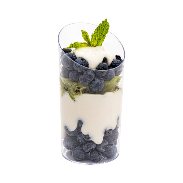 Impress your guests with an elegant dessert presentation using our Mini Serve 5-ounce Round Clear Plastic Large Incline Tube Glasses with Silver Plastic Mini Forks. These incline glasses are crafted from high-quality plastic and designed with an angled open-top design and translucent finish to flawlessly showcase layered treats and brightly colored appetizers while dazzling onlookers. With a capacity of 5 ounces, these disposable plastic glasses are ideal for serving individual portions of citrus-marinated snapper ceviche or strawberry shortcake at catered events and bakeries. These 4-inch forks have a shiny silver finish and sturdy handles built to stand up to substantial bites, effortlessly enhancing your table setting. To streamline your cleaning process, these parfait cups and appetizer forks are conveniently disposable. These clear cups measure 2.25 inches in diameter by 4.25 inches in height and have a capacity of 5 ounces, while the plastic forks measure 4 inches in length. Each order includes 100 glasses and 100 forks.
