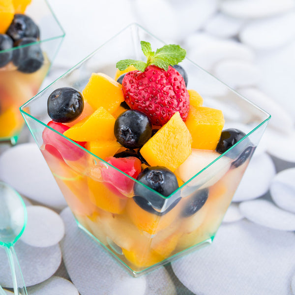 Add instant charm and whimsy to your dessert presentations with our Mini Serve 6-ounce Square Seagreen Plastic Large Girata Dishes with Silver Plastic Mini Forks. Crafted from premium plastic, these disposable cups boast heavy-duty durability and are perfect for serving various cold food items. These dessert cups are designed in an unconventional oblique shape with a tinted-seagreen finish, making them ideal for serving fruit salads, parfaits, puddings, and gelatos with style. Paired with the silver plastic forks, these serving dishes elevate all tablescapes or event decor. These square dishes have a capacity of 6 ounces and are perfect for serving single portions of parfaits, mousse, tiramisus, or cheesecake. The strong and sturdy handles of these 4-inch forks can withstand hearty bites of cake and pie. Conveniently disposable, these parfait cups and appetizer forks are ideal for large social events as they provide a swift cleanup. Measuring 3.25 inches in length by 2.75 inches in width by 3 inches in height, these food cups have a capacity of 6 ounces, while the included plastic forks measure 4 inches in length. Each order includes 100 dishes and 100 forks.