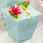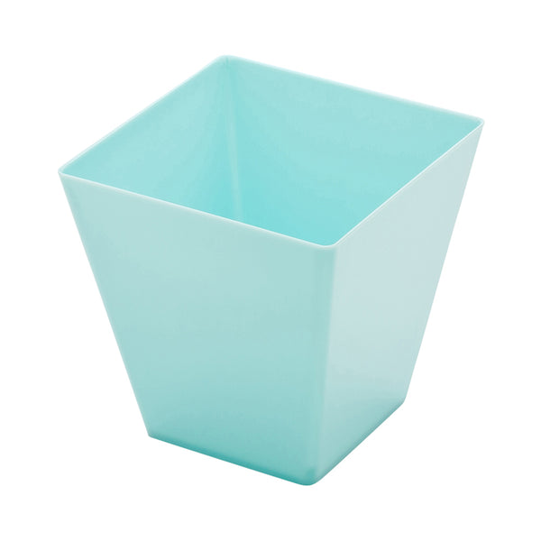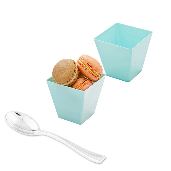 Elevate your culinary presentations with our Bundle: Mini Serve 100 8-ounce Square Baby Blue Plastic Large Kova Cups with 100 Silver Plastic 4-inch Mini Spoons. This bundle includes baby blue plastic cups and mini spoons, perfectly complementing each other. These appetizer cups and spoons are made from a robust plastic that withstands breakages and cracks, ensuring long-lasting performance. The geometric square silhouette of these plastic cups delivers an appealing aesthetic to your dessert bars or salad stations. With a stylish baby blue shade and sleek, tapered design, these plastic cups amplify the elegance of your presentations. The shiny silver finish of the plastic spoons effortlessly enhances the presentation of your tantalizing dishes. With their strong and sturdy handles, these 4-inch spoons can stand up to hefty bites and big scoops. For an efficient cleanup, these disposable cups and spoons can be discarded after use. Measuring 2.75 inches in length by 2.75 inches in width by 2.75 inches in height, these square cups can hold up to 8 ounces. Each order includes 100 cups and 100 spoons.