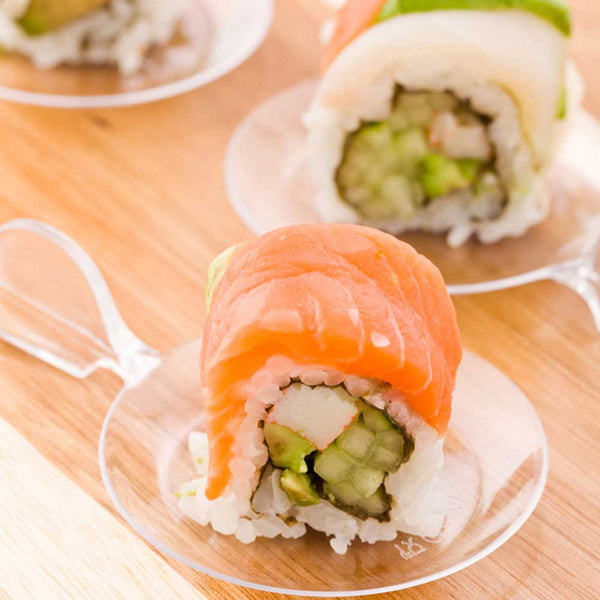 Set a stylish table with our Bundle: Mini Serve 100 Clear 3.7-inch Plastic Fish Tasting Plates with 100 Silver Plastic 4-inch Mini Spoons. This bundle includes elegant fish-shaped clear plastic plates and sleek silver plastic spoons. These fish-shaped plates complement any event tablescape with their modern design, providing a comfortable grip for guests while showcasing appetizers or desserts with their crystal-clear finish. The disposable design of these plates ensures quick cleanup, making them ideal for catered events. Accompanying these plates are the shiny silver plastic spoons, designed to effortlessly enhance the presentation of your tantalizing dishes with their 4-inch length, perfect for plating miniature bites like tuna tartare or personal-sized strawberry shortcakes. The sturdy handles of these spoons can handle hefty portions, from polenta to gelato, without compromising on elegance. Measuring 3.75 inches in length by 2.5 inches in width for the plates and 4 inches in length for the spoons, this bundle offers a convenient solution for upscale events. Each order includes 100 plastic plates and 100 mini spoons.