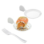 Present your culinary masterpieces with our Mini Serve Fish White Plastic Tasting Plates with Silver Plastic Mini Forks. Featuring a unique fish-inspired design with a sleek white finish, these serving plates infuse a dash of refined whimsy into your table decor, making them the go-to choice for stylish soirees or themed affairs. Crafted from premium-quality PS plastic, the decorative plates and tasting forks are disposable, encouraging an easy cleanup after meals. Each appetizer plate has a built-in handle for practicality, ensuring effortless serving and handling of bite-sized delights at your social gatherings. These plastic plates measure 3.75 inches in length by 2.5 inches in width by 1 inch in height, while the plastic forks measure 4 inches in length. Each order includes 100 plates and 100 forks.