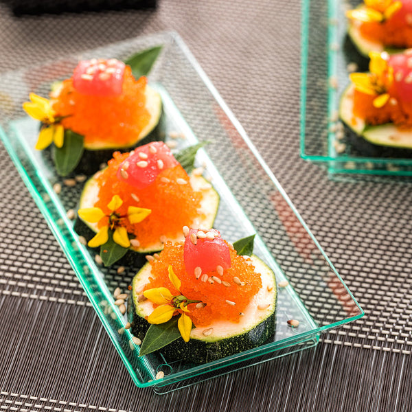 Embrace sophisticated dining with our Mini Serve Rectangle Seagreen Plastic Plates with Silver Plastic Mini Forks. Constructed from high-quality PS plastic, these rectangle plates and single-use forks are disposable, guaranteeing a swift cleanup solution. The enchanting tinted-seagreen hue and the raised rim design of these plastic plates provide an eye-catching backdrop for a myriad of appetizers, desserts, and other culinary creations. Accompanied by these tasting forks designed with sturdy handles and a shiny silver finish, the meal presentation is elevated, adding a touch of class and refinement to your event. The robust yet lightweight structure of these serving dishes and silver plastic forks ensures easy handling and durability throughout your catering needs. These dessert plates measure 5 inches in length by 2.5 inches in width by 0.5 inches in height, while the included cake forks measure 4 inches in length. Each order includes 100 plates and 100 forks.