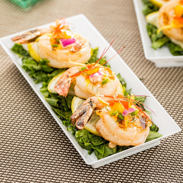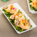 Serve appetizers and desserts in style with our Bundle: Mini Serve 100 Rectangle White 5-inch Plastic Plates with 100 Silver Plastic 4-inch Mini Spoons. This bundle includes durable rectangular plastic plates and premium silver plastic spoons, designed to enhance the presentation of your tantalizing dishes. Featuring raised edges to securely retain food and a chic white finish these plastic plates adds sophistication to your culinary displays. The disposable design of these plates simplifies post-event cleanup. Complementing these plates are the shiny silver plastic spoons, effortlessly elevating the presentation of your appetizers and desserts with their sleek finish. These 4-inch spoons boast sturdy handles that can withstand hefty bites, making them perfect for serving polenta, gelato, and more. These plates measure 5 inches in length by 2.5 inches in width, and hold up to 2 ounces of food, while the spoons measure 4 inches in length. Each order includes 100 plastic plates and 100 mini spoons.