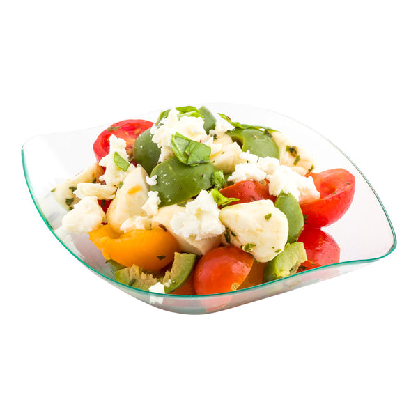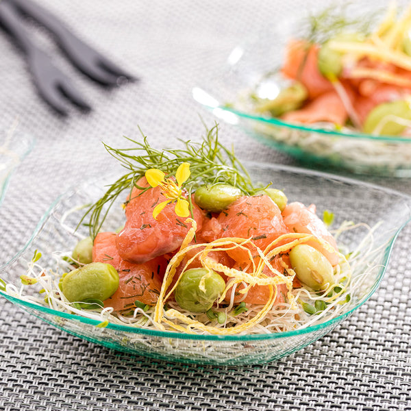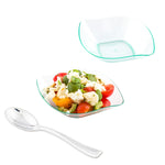 Elevate your catered events with our Bundle: Mini Serve 100 Seagreen Plastic 3.5-inch Comma Plates with 100 Silver Plastic 4-inch Mini Spoons. This bundle comprises exquisitely designed seagreen plastic comma plates and premium silver plastic mini spoons, ensuring a sophisticated display for your bite-sized delicacies. The unique skewed comma design of the seagreen plates lends a distinct aesthetic, while their sturdy construction averts chipping and breakage, ensuring long-lasting use. Crafted from premium plastic, these disposable plates represent an excellent choice for foodservice businesses. The sleek seagreen finish of these plates renders them a stylish addition to any catered event or restaurant setup, ideal for serving fruit, shrimp, desserts, salads, or any other bite-sized delicacies with an effortless cleanup. Complementing the plates are the shiny silver plastic mini spoons, designed to effortlessly enhance the presentation of your tantalizing dishes with their 4-inch length and sturdy handles, perfect for accompanying miniature tuna tartare, personal-sized strawberry shortcakes, hefty bites of polenta, and big scoops of gelato. Made from premium plastic, these appetizer spoons are conveniently disposable and recyclable, making them a perfect flatware option for cafes and venues. The plates measure 3.5 inches in length by 4.5 inches in width, while the spoons measure 4 inches in length. Each order includes 100 plastic plates and 100 mini spoons.