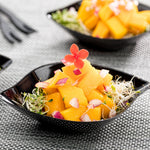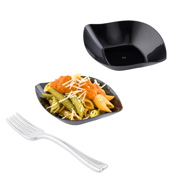100 SQUARE BLACK 3.5" PLASTIC COMMA PLATES AND 100 MINI FORKS