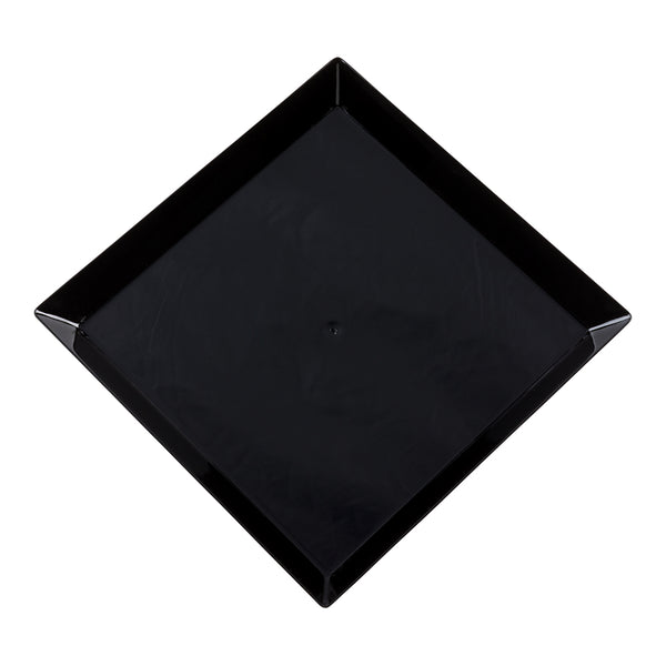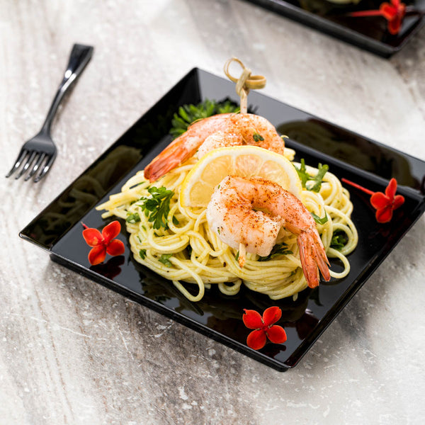 Serve gourmet portions with our Bundle: Mini Serve 100 Square Black 5-inch Plastic Medium Modern Plates with 100 Silver Plastic 4-inch Mini Spoons. This bundle includes our premium black plastic plates and shiny silver plastic spoons, both designed to enhance the presentation of your dishes. These square black plates boast a distinctive raised edge that securely holds food without spills, while their durable plastic construction ensures they won't chip or break during use. These disposable plates offer a streamlined solution for post-event cleanup. Complementing the plates are our 4-inch silver plastic spoons, featuring sturdy handles that can withstand hefty bites and scoops, making them ideal for serving everything from miniature tuna tartare to personal-sized strawberry shortcakes or gelato. These plastic medium plates measure 5 inches in length by 5 inches in width. Each order includes 100 plastic plates and 100 mini spoons.