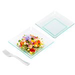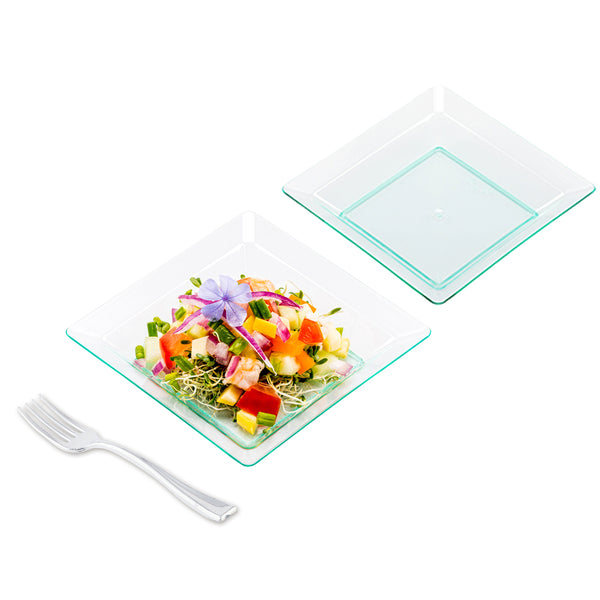100 SQUARE SEAGREEN 4.25" PLASTIC PLATES AND 100 MINI FORKS