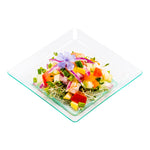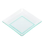 Enhance the allure of your hors d'oeuvres and desserts with our Mini Serve Square Seagreen Plastic Plates with Silver Plastic Mini Forks. Engineered using high-quality PS plastic, these food plates and dessert forks are designed to be both disposable to facilitate a swift cleaning process. The elegant tinted-seagreen finish and square design of these disposable plates offer an immediate uplift to the presentation of dishes, taking everything from savory meatballs to macarons a notch higher. Complemented with sleek silver plastic forks, these serving plates curate a high-end tablescape that fits perfectly for gourmet dining establishments, catering services, and modern parties. Each cake fork boasts reinforced, robust handles that promise resilience even against the heartiest bites. These square plates measure 4.24 inches in length by 4.25 inches in width by 0.5 inches in height, while the included tasting forks measure 4 inches in length. Each order includes 100 plates and 100 forks.