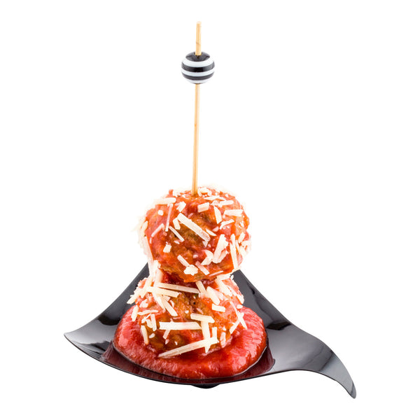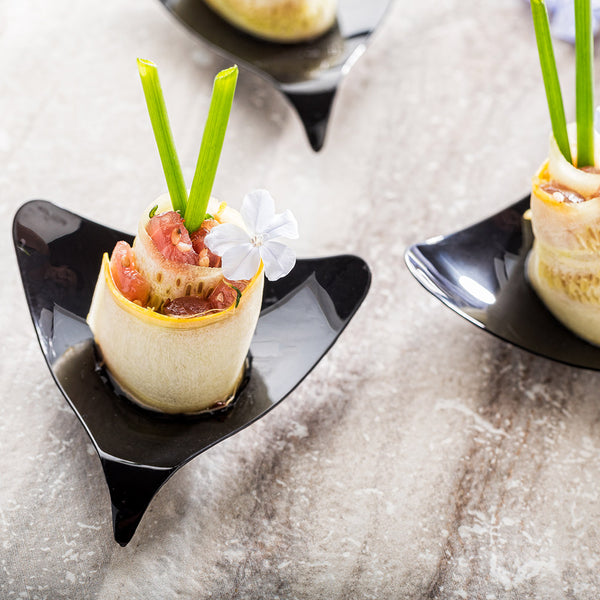 Entertain guests in style with our Mini Serve Triangle Black Plastic Shooting Star Appetizer Plates with Silver Plastic Mini Forks. Crafted from durable PS plastic, these triangle plates and tasting forks are disposable for easy cleanup, making them an excellent choice for your next event or gathering. These black plastic plates feature a distinctive scalene triangle design to elevate single-serve appetizers and hors d'oeuvres with a modern touch. Accompanying these disposable plates are these silver plastic forks designed with a sturdy yet lightweight construction to stand up to hearty scoops of appetizers or desserts. These mini appetizer dishes measure 3 inches in length by 3 inches in width, while the included single-use forks measure 4 inches in length. Each order includes 100 plates and 100 forks.