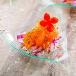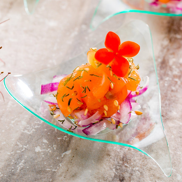 Serve your guests in a distinguished manner with our Mini Serve Triangle Seagreen Plastic Shooting Star Appetizer Plates with Silver Plastic Mini Forks. Manufactured from premium PS plastic, these triangle plates and cake forks are disposable, providing an easy cleanup solution for your upcoming event or function. Designed with a unique scalene triangle shape, these mini appetizer plates bestow a modern effect on individual appetizers and hors d'oeuvres servings. Accompanying the party plates are these silver plastic forks, designed for durability with lightness to withstand robust portions of appetizers or sweetmeats. These disposable plates measure 3 inches long by 3 inches wide, while the included tasting forks measure 4 inches long. Each order includes 100 plates and 100 forks.