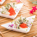Lend your catered events a chic touch with our Mini Serve White Plastic Mini Triangolo Appetizer Plates with Silver Plastic Mini Forks. These tasting dishes possess a geometric triangular design with a white finish, providing an elegant backdrop for presenting your scrumptious appetizer selection. Crafted from high-quality PS plastic, these mini appetizer plates and dinner forks are disposable, ensuring post-meal easy cleanup. Paired with these disposable plates are the cake forks, built for enduring hearty servings. These triangle plates measure 4 inches long by 2 inches wide, while the silver plastic forks measure 4 inches in length. Each order includes 100 plates and 100 forks.
