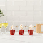 Elevate your dessert presentation with ergonomic ease. Mini Serve Ergonomic Mini Dessert Cups feature a mini handle that provides a comfortable and secure grip, ensuring seamless service of mini dessert cups during bustling events. These dessert shooters boast a sturdy design, perfect for withstanding the demands of outdoor gatherings and minimizing the risk of breakage. Crafted from durable plastic, these dessert shot glasses maintain their crystal-clear appearance while being cold food friendly, making them ideal for chilled treats. The disposable convenience of these cups streamlines cleanup, maximizing efficiency in busy kitchens and allowing staff to focus on delivering exceptional service. Enhance your service with these essential catering cups that measure 2.67 inches in length and width by 3.34 inches in height. Sold in a 100 count box.