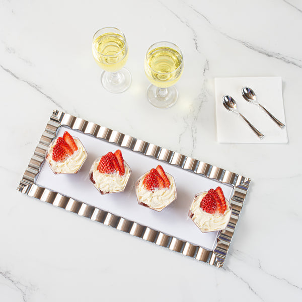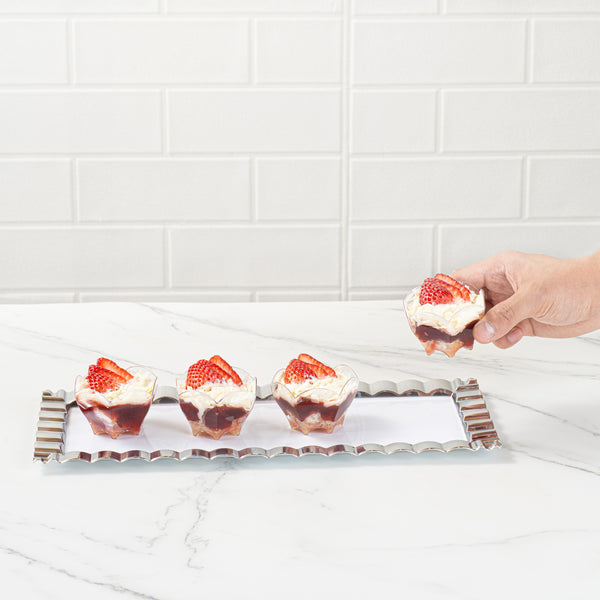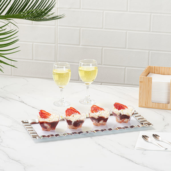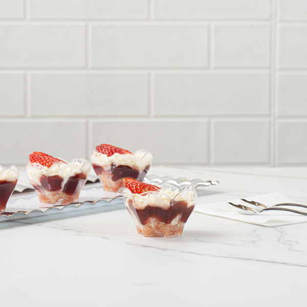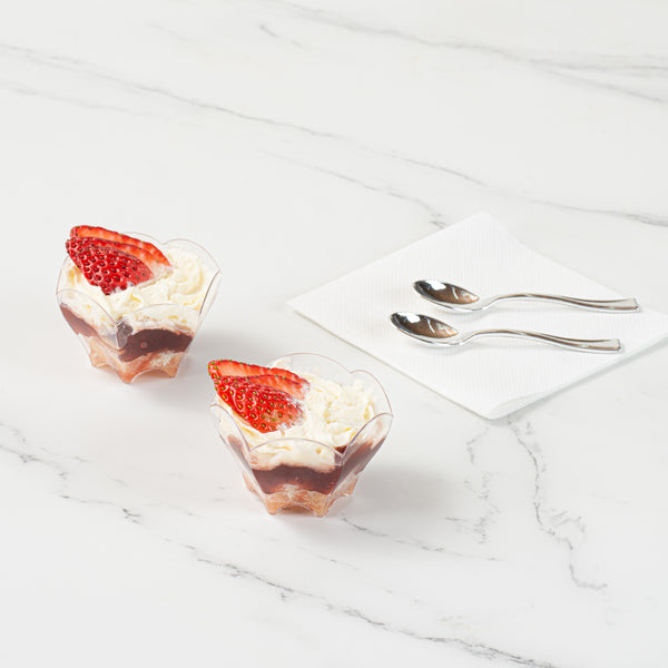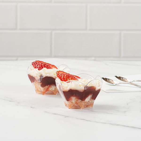 Make desserts unforgettable with elegant servingware. The Mini Serve Plastic Dessert Cup showcases an elegant flower design that elevates culinary creations, making it ideal for unforgettable events. Crafted from durable plastic, this plastic dessert cup ensures outdoor events proceed smoothly without the fear of breakage, enhancing reliability in bustling environments. The clear dessert cup is designed with disposable convenience, facilitating effortless cleanup, which is perfect for busy kitchens and catering services. Measuring 2.8 inches in length, it offers the ideal size for showcasing delectable treats while maintaining a pristine presentation with its clear, cold food-friendly material. Transform any occasion with these mini dessert containers that combine style and practicality. Sold in a 100 count box.