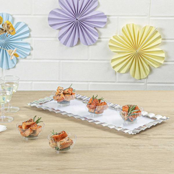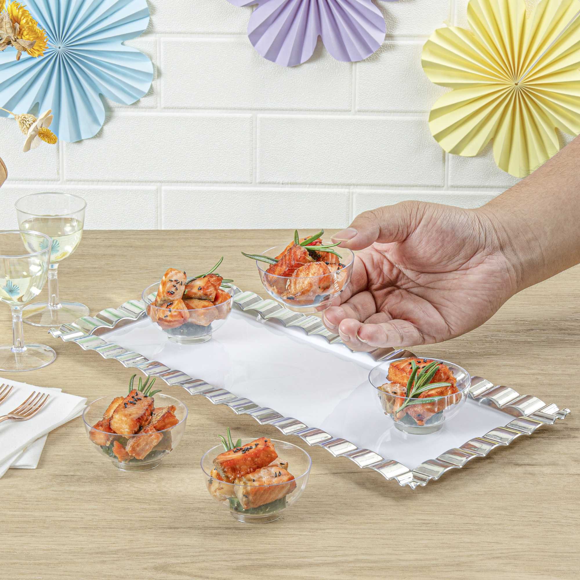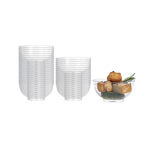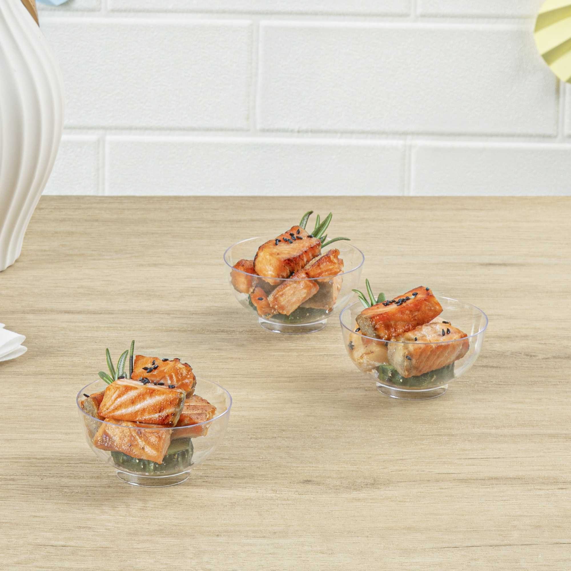 Impress your guests with exquisitely served bite-sized tapas and miniature desserts in our Mini Serve 2-ounce Round Clear Plastic Coppa Bowls. Boasting a striking transparent design and refined raised base, these individual dessert cups are an exceptional choice for weddings, cocktail parties, and other catered affairs. The dome-shaped mini dessert cups are constructed from high-quality plastic, ensuring they won't break, providing reliability. To beautifully showcase your hors d'oeuvres, utilize these clear mini appetizer bowls for desserts or for sampling appetizers during tasting events. Measuring 2.5 inches in diameter and 1 inch in height, each disposable plastic bowl has a 2-ounce capacity. Sold in a 100 count box.