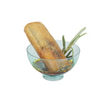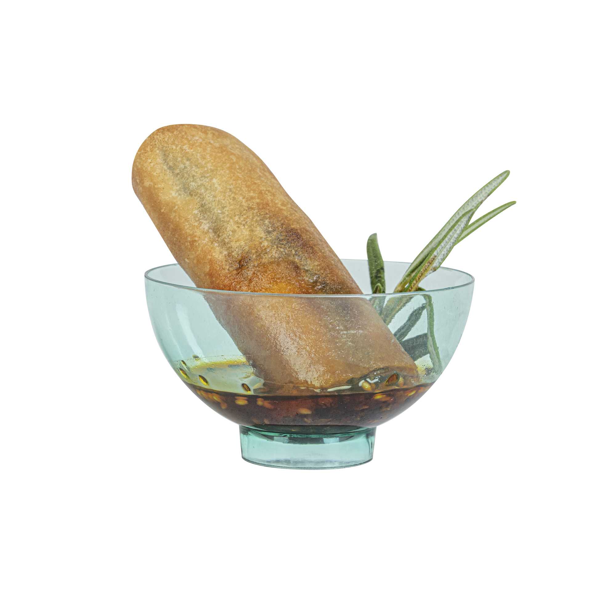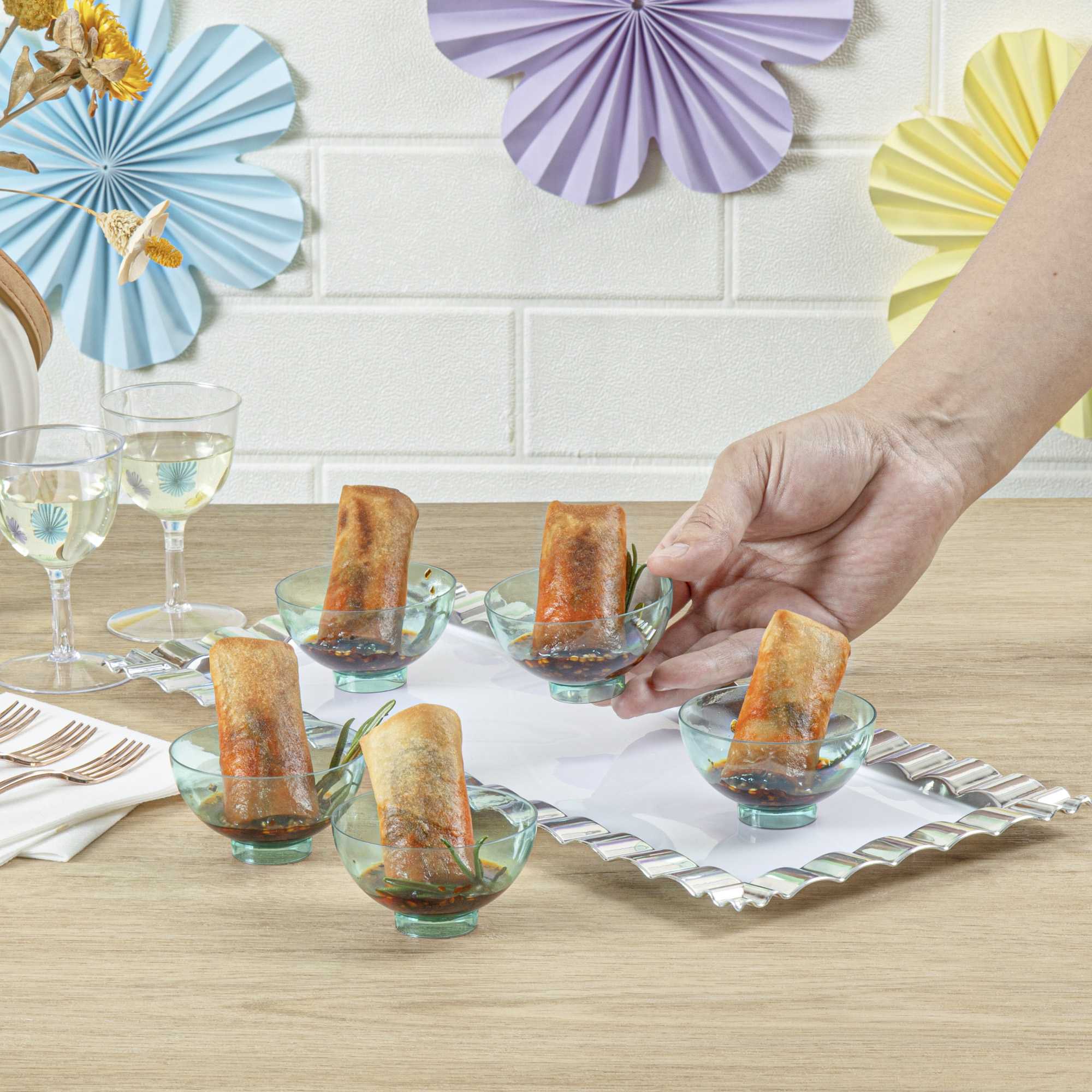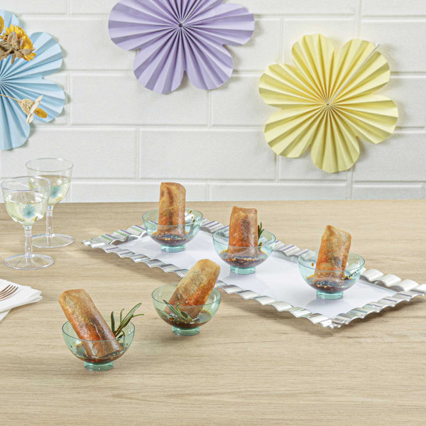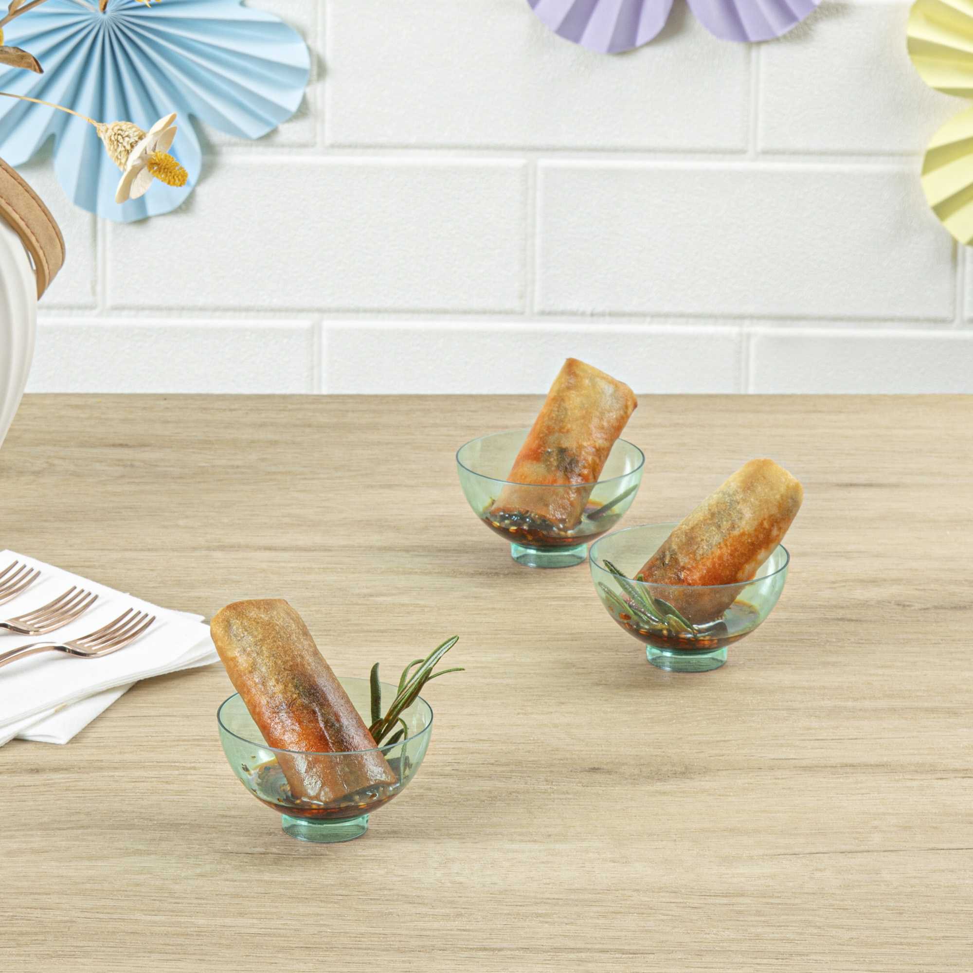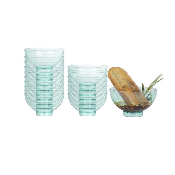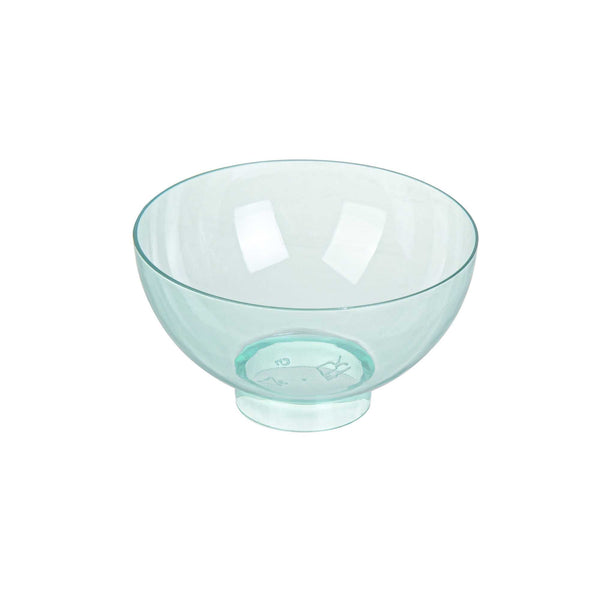 Dazzle guests with bite-sized tapas and miniature desserts elegantly plated in these Mini Serve Seagreen Coppa Bowls. Designed with an eye-catching translucent seagreen finish and a sophisticated raised base, these individual dessert cups are perfect for weddings, cocktail parties, and other catered events. These dome-shaped mini dessert cups are made from premium plastic and do not break, ensuring dependability. For impressively presenting hors d'oeuvres, use these seagreen mini appetizer bowls to serve individually poached shrimp with herbed garlic aioli or one-bite portions of sauteed rice noodles. Each disposable plastic bowl measures 2.5 inches in diameter by 1 inch in height and holds up to 2 ounces. Sold in a 100 count box.