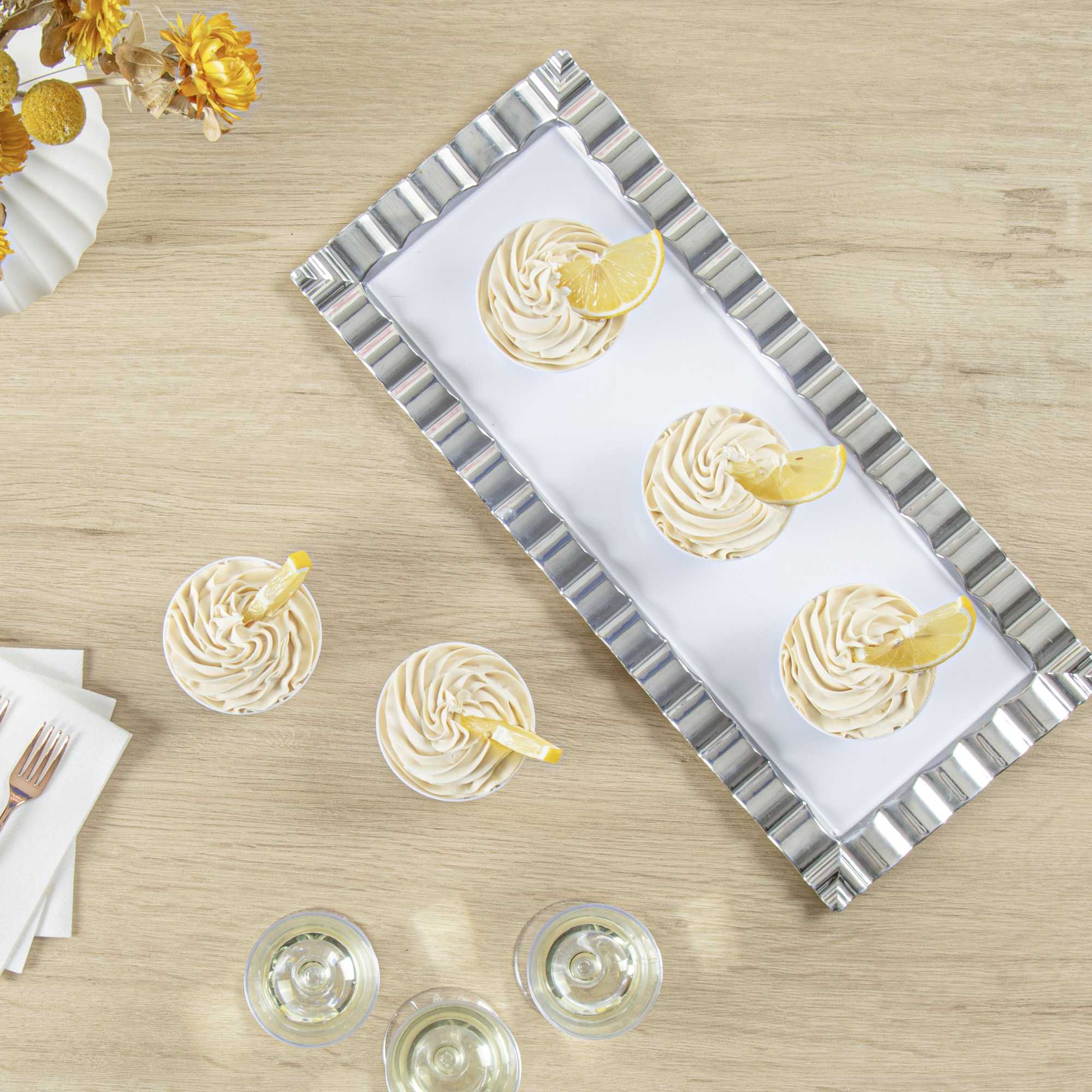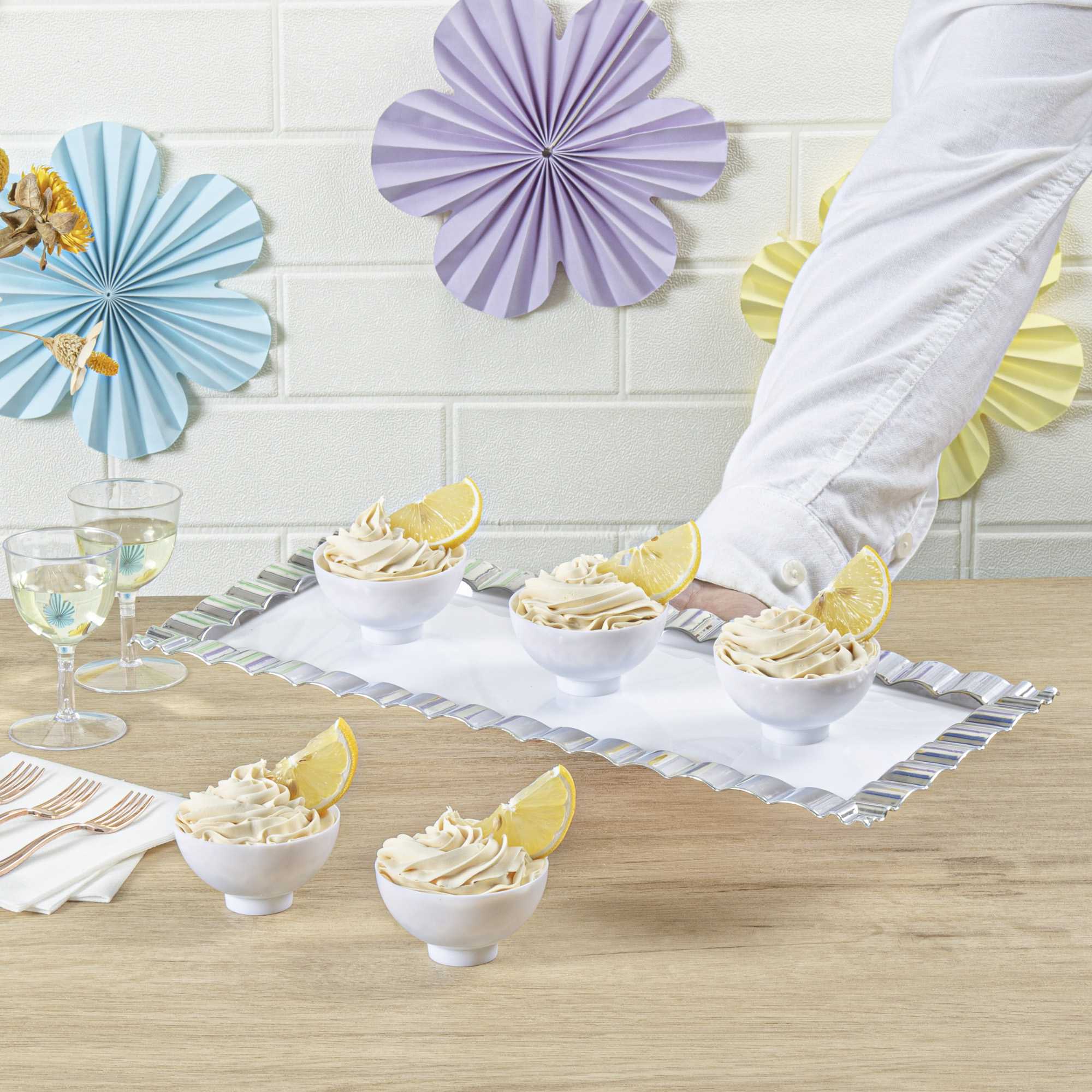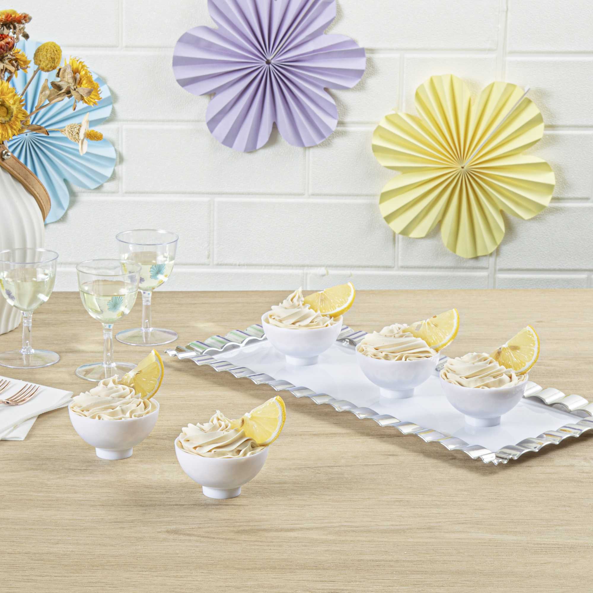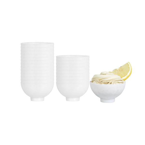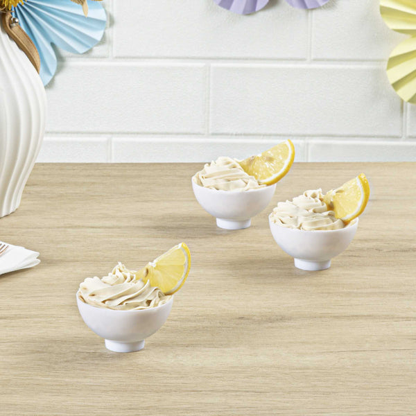 Give your miniature appetizers and bite-sized desserts an alluring twist with our Mini Serve 2-ounce Round White Plastic Coppa Bowls. Featuring a captivating white finish and an elevated base, these dessert cups add a touch of sophistication to weddings, cocktail parties, and other catering events. These mini dessert cups, shaped in a unique dome design, are crafted from sturdy plastic, ensuring their resistance against breakage for reliable service. To make an impressive presentation of your hors d'oeuvres, these mini seagreen appetizer bowls can be used to serve individual portions of sauteed rice noodles. Each disposable plastic bowl measures 2.5 inches in diameter by 1 inch in height and holds up to 2 ounces. Sold in a 100 count box.