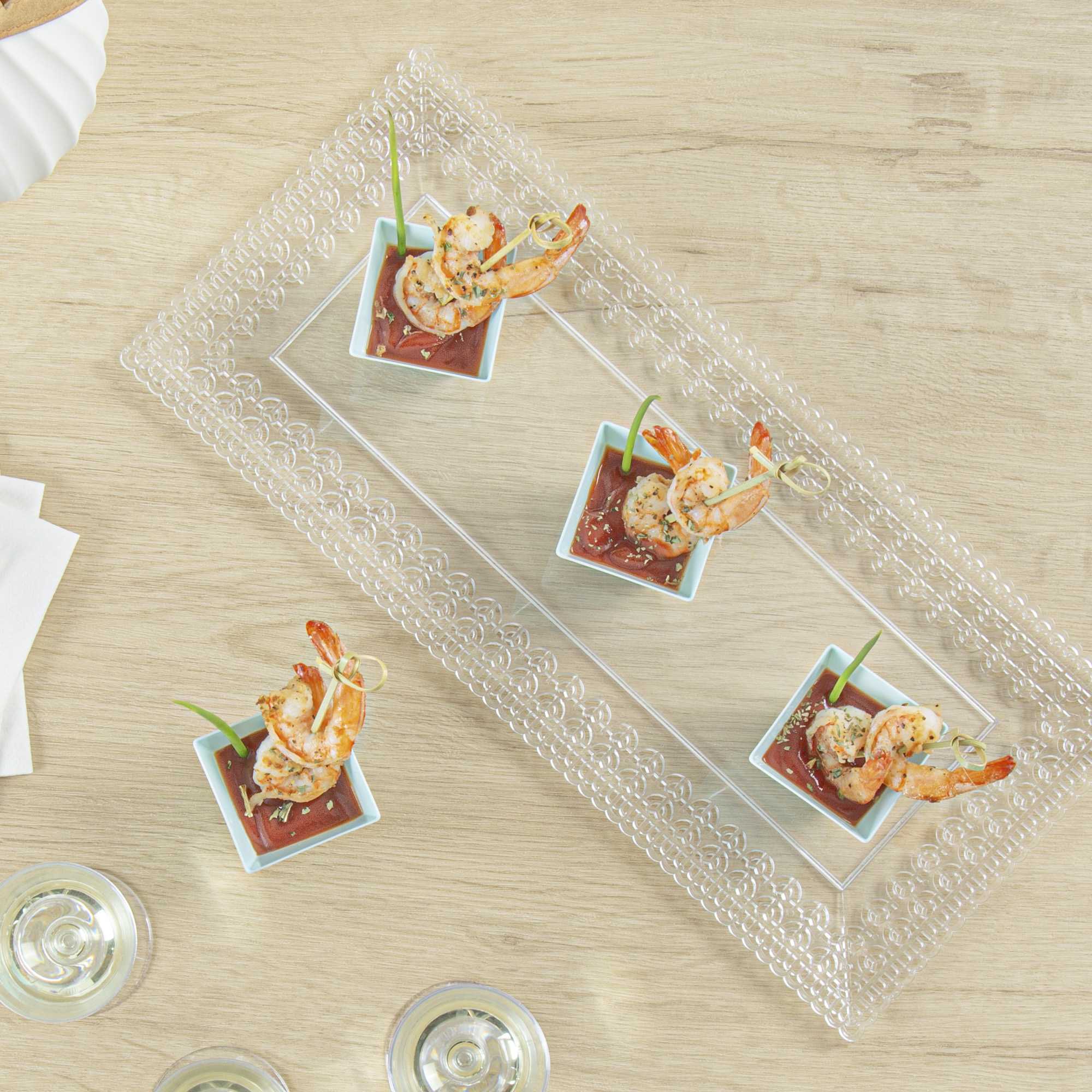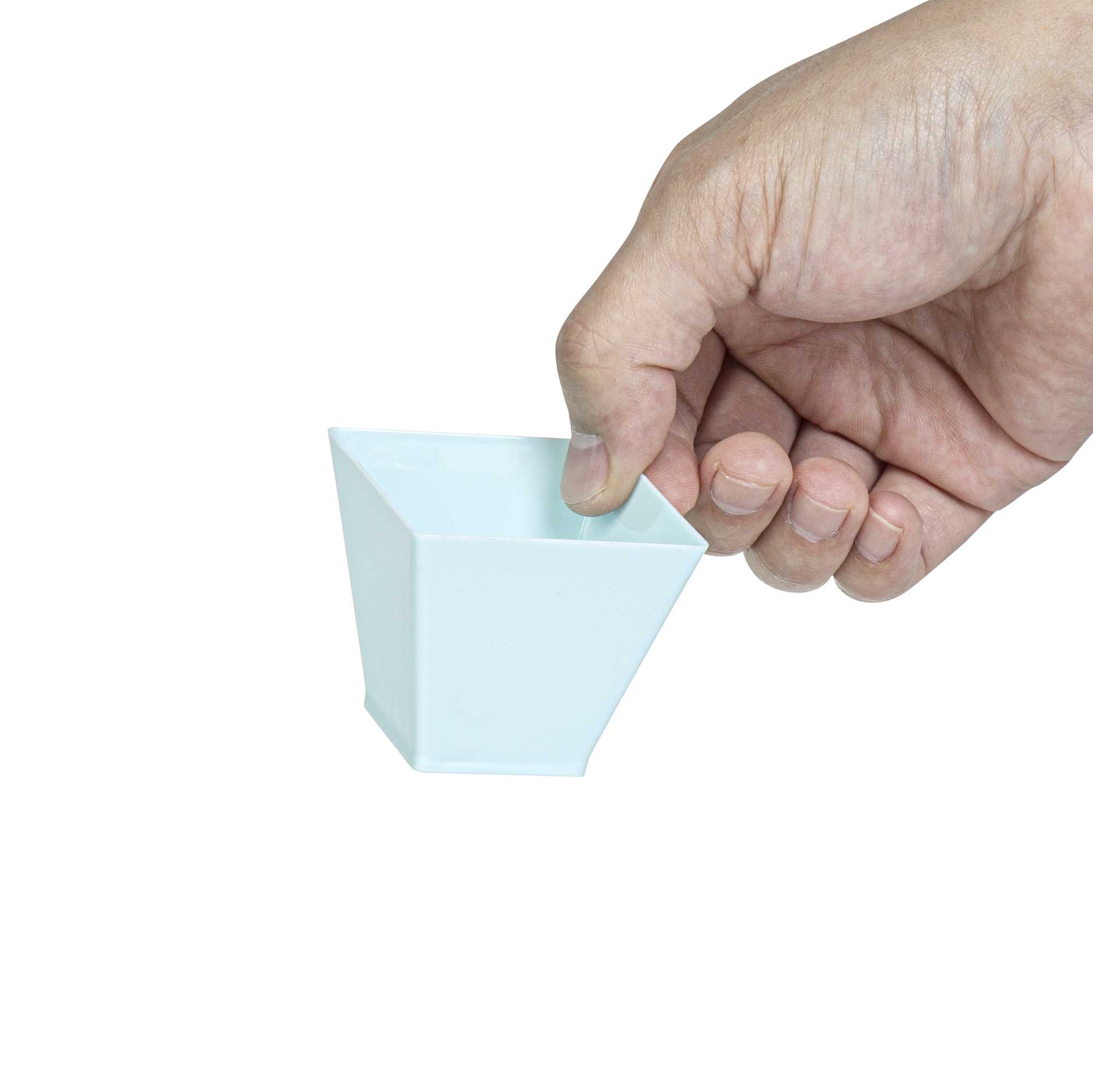 Personalize your presentation using our Mini Serve 2-Ounce Square Baby Blue Plastic Mini Kova Cups. These kova cups are meticulously crafted for durability, ensuring a seamless event experience. Featuring smooth rims, these plastic mini cups ensure a pleasurable dining experience. The distinctive baby blue hue of these recyclable mini plastic cups brings an elegant and fun element to your presentation, making them a fitting choice for any occasion. Tailored for bite-sized appetizers, desserts, or beverages, these 2-ounce treat cups are a fantastic addition to your menu. Designed for one-time use, these disposable snack cups streamline the cleanup process, leaving you with more time to enjoy your event. Pair these cups with our Mini Serve matching lids (SKU: RWP0305C) to protect the contents Measuring 2 inches in length by 2 inches in width by 1.75 inches in height, these disposable kova cups are efficient for storage purposes. Sold in a 100 count box