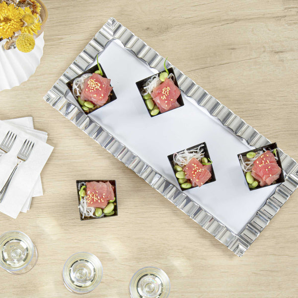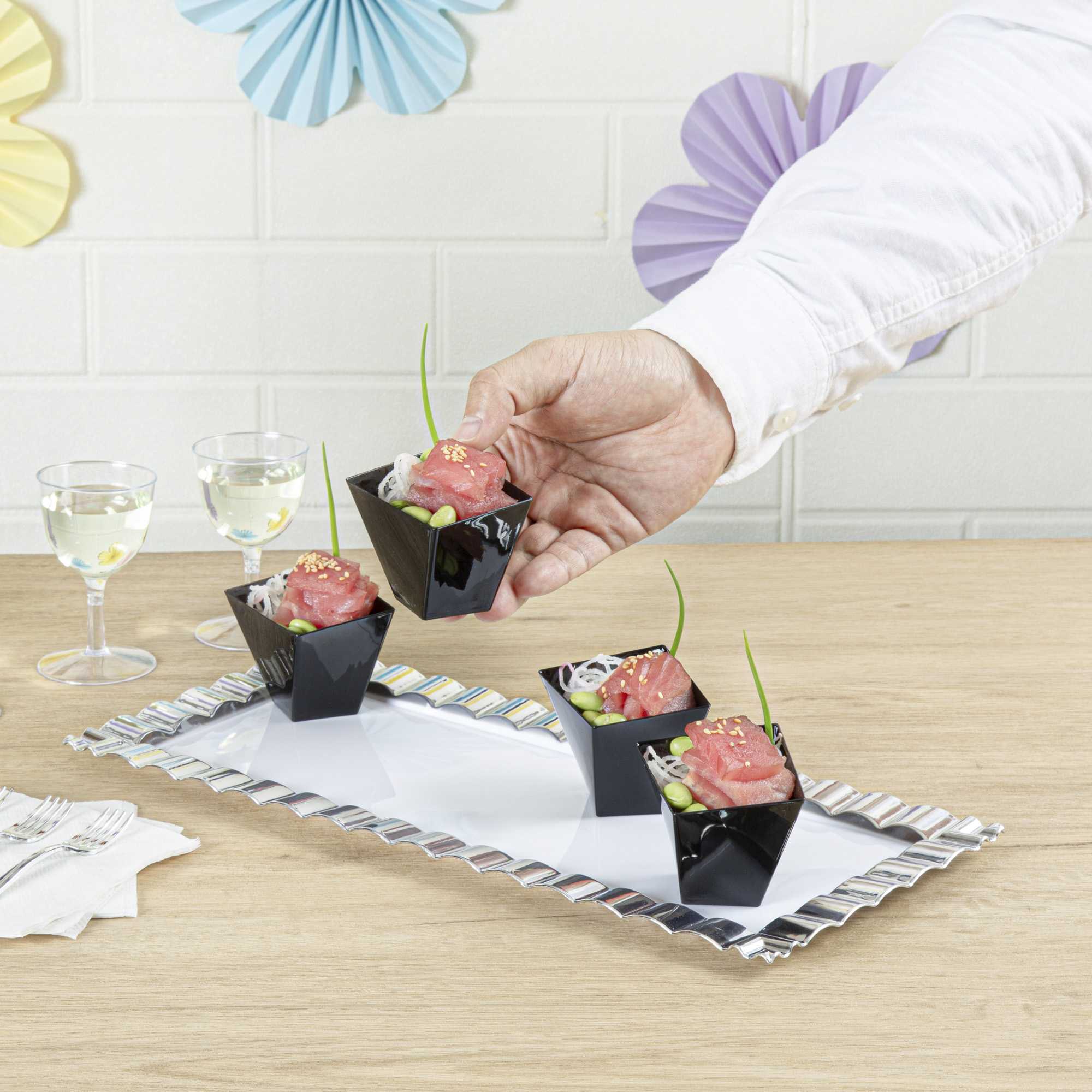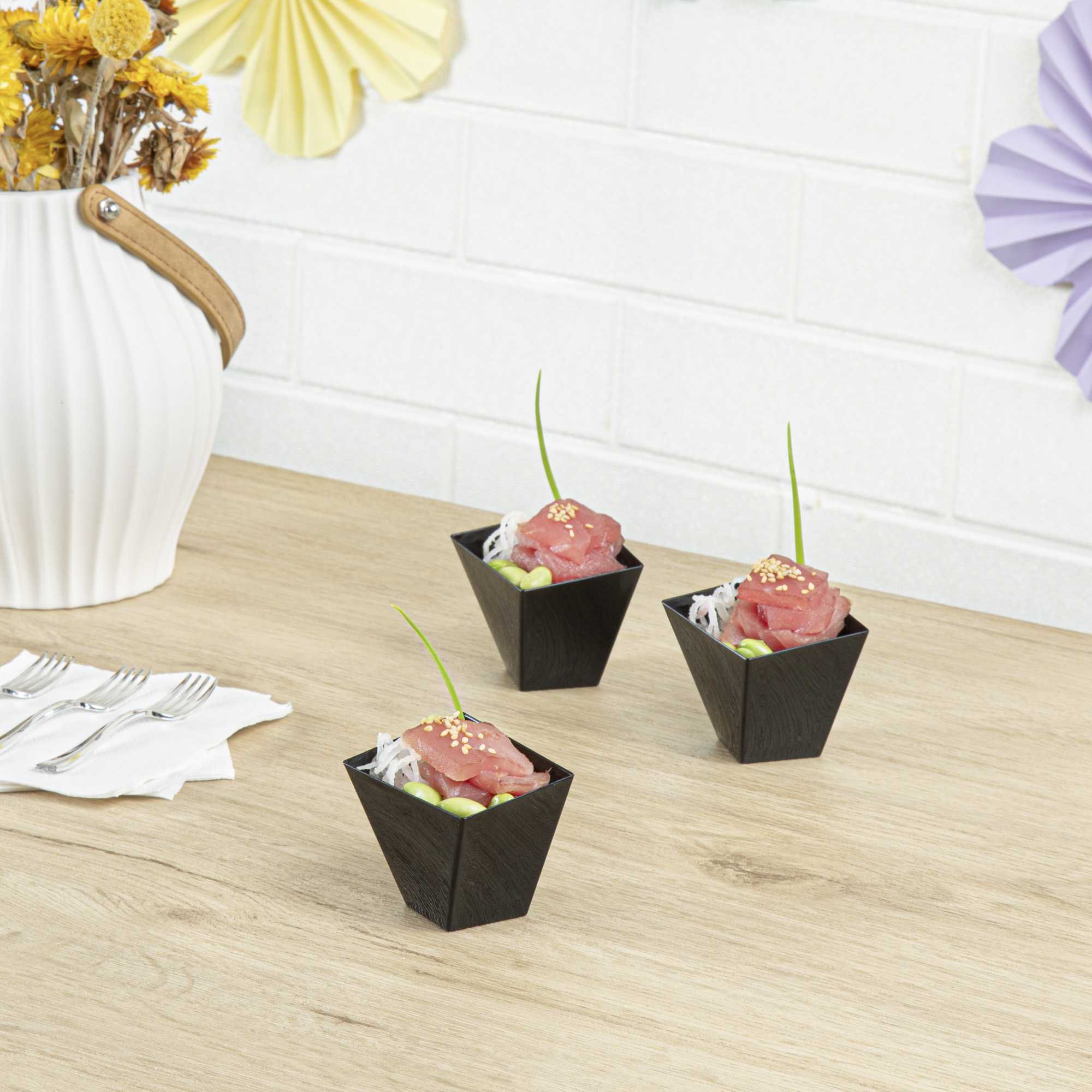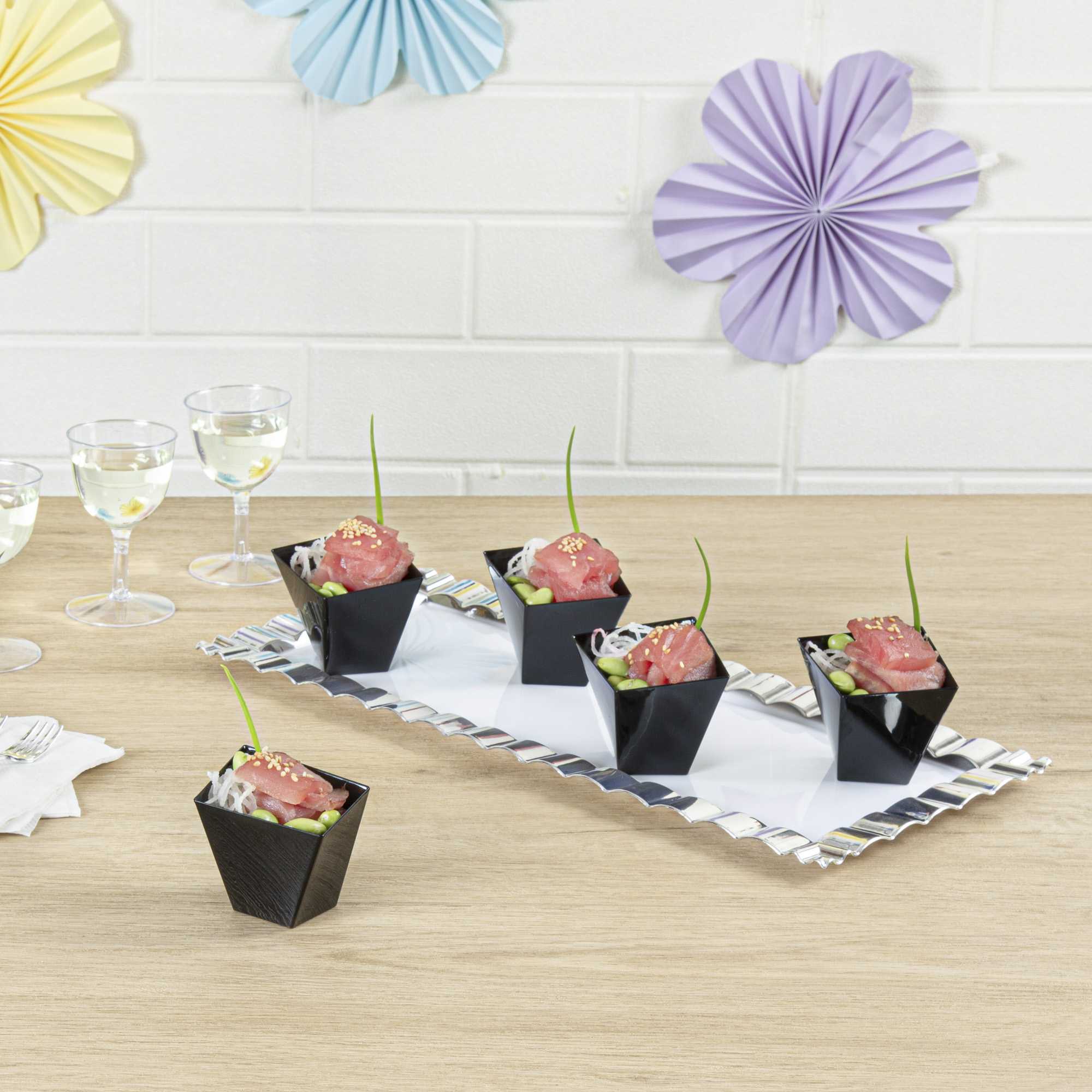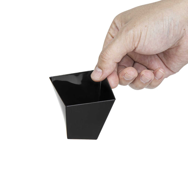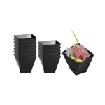 Delight your guests with our Mini Serve 2-ounce Square Black Plastic Girata Dessert Dishes. Fabricated from PS plastic, these black plastic cups assure durability, smoothly catering to various dessert servings. Showcasing a quadrilateral-shaped design, these Girata dessert dishes offer a visual appeal, enhancing the presentation of your delicious offerings. Sporting a lustrous black finish, these appetizer cups add a distinctive touch of elegance to any occasion. Versatile in their uses, these mini dessert cups are perfect for serving a range of mini appetizers to sweet delicacies. These disposable mini dessert dishes grace your event with convenience, simplifying the cleaning process after parties. With a capacity of 2 ounces and dimensions of 2 inches in length by 2 inches in width by 1.75 inches in height, these dessert cups are apt for serving bite-sized treats, sustaining a compact and chic look. Sold in a 100 count box.