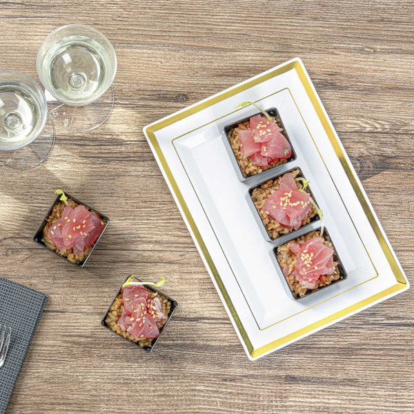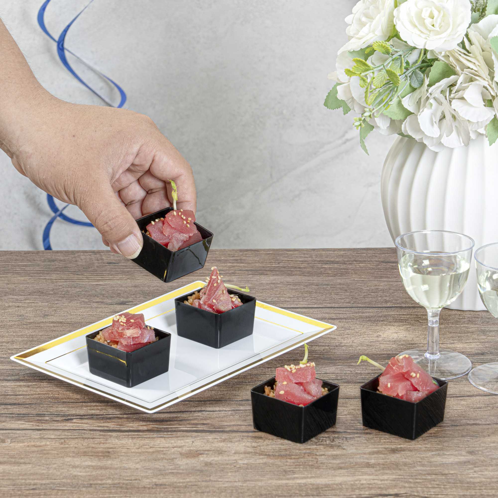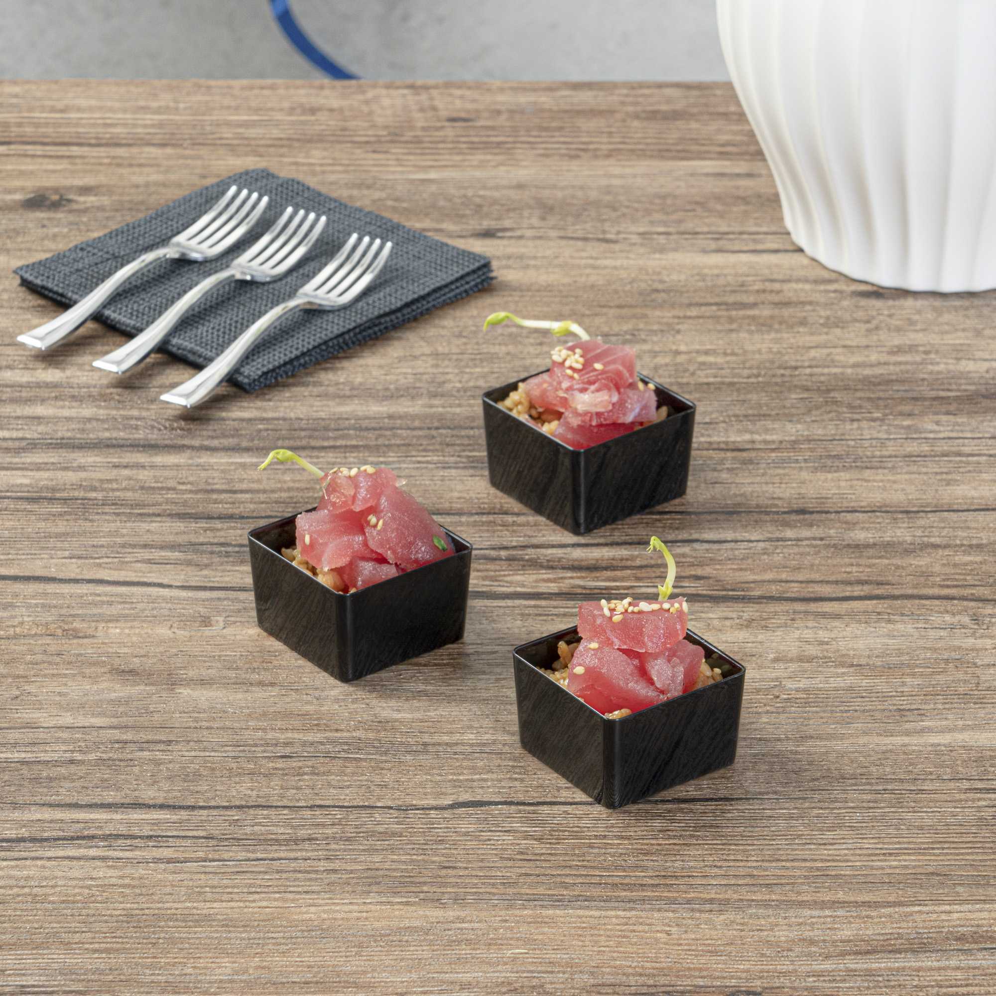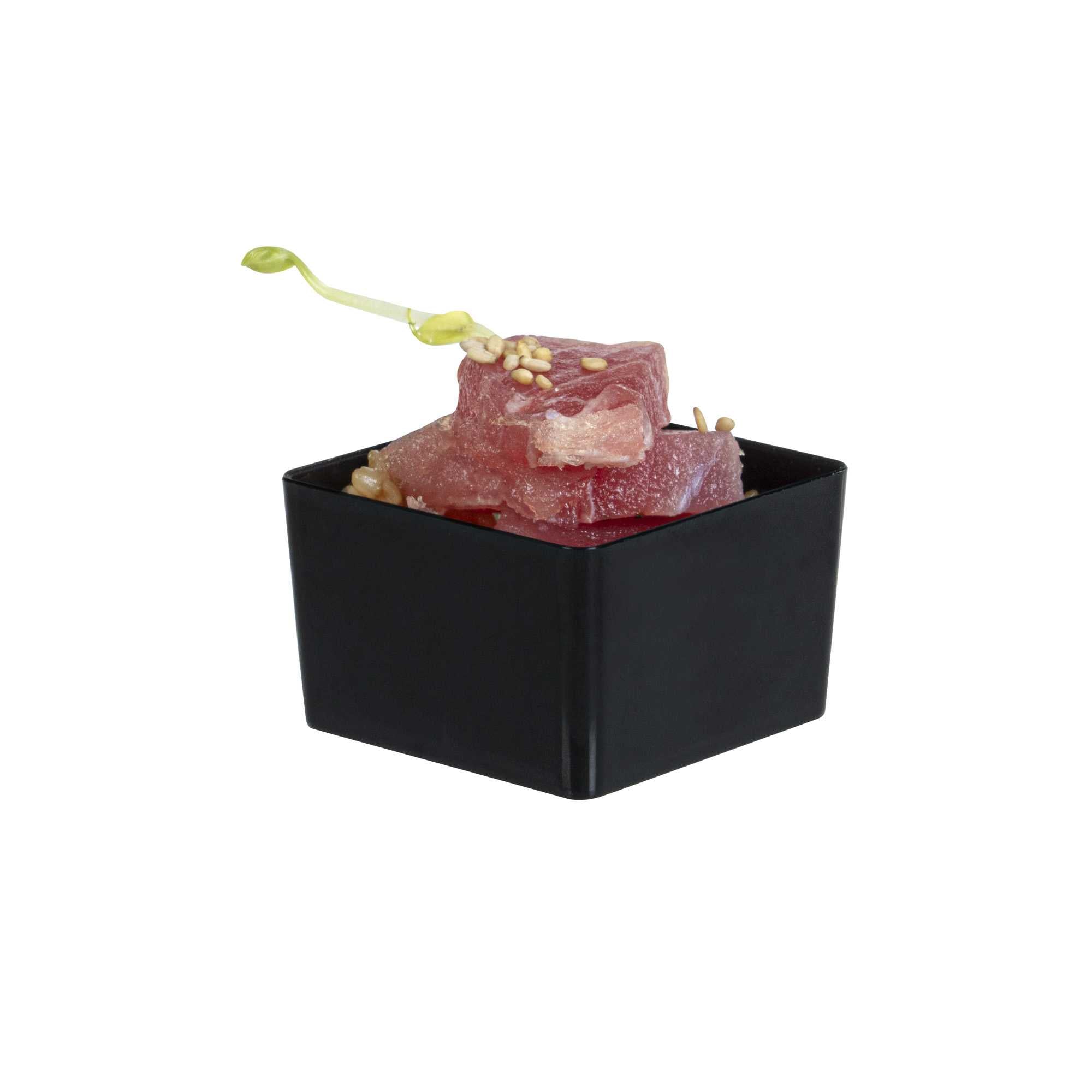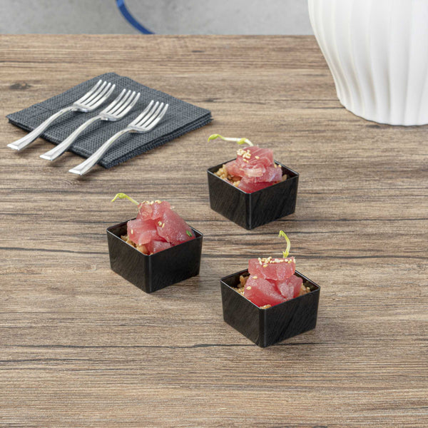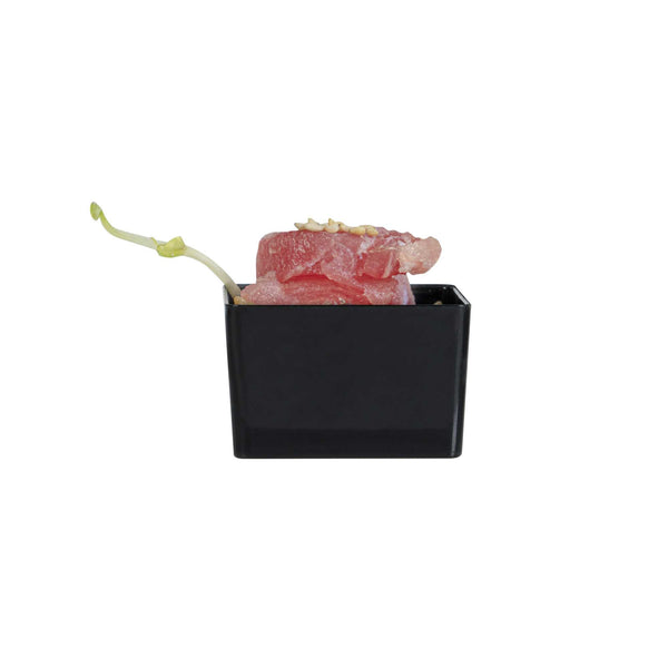 Present dessert in a fashionable manner in our Mini Serve 2-ounce Square Black Plastic Short Quadrato Cups. These clear dessert cups are made from high-quality plastic for maximum durability. Designed with straight sides and a square base, these mini dessert cups have an elegant cube shape. These 3-ounce dessert bowls have thick walls to prevent cracking or breaking. With a modern black finish, these square dessert cups provide a sleek style perfect for upscale events. These cube-shaped plastic dessert bowls are recyclable and disposable for sustainable use and easy post-event cleanup. With a capacity of 2 ounces and measuring 1.75 inches in length by 1.75 inches in width by 1 inch in height, these plastic dessert bowls are perfectly sized for individual treats and securely contain contents. Sold in a 100 count box.