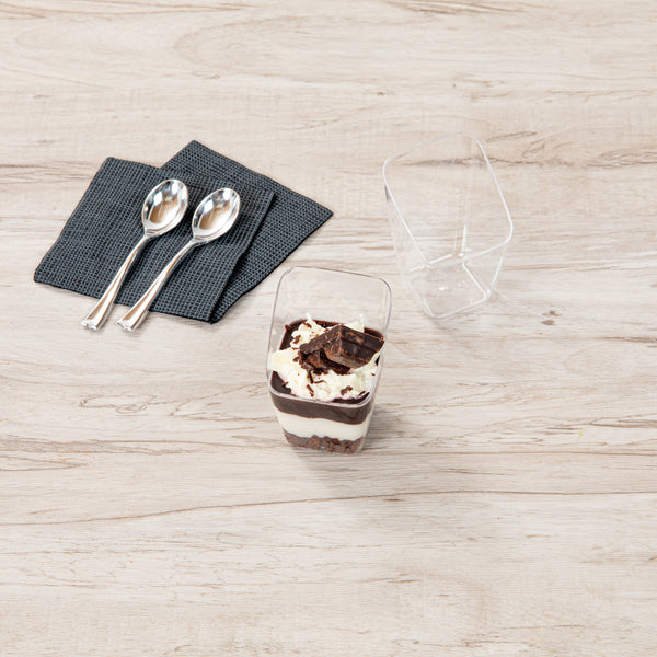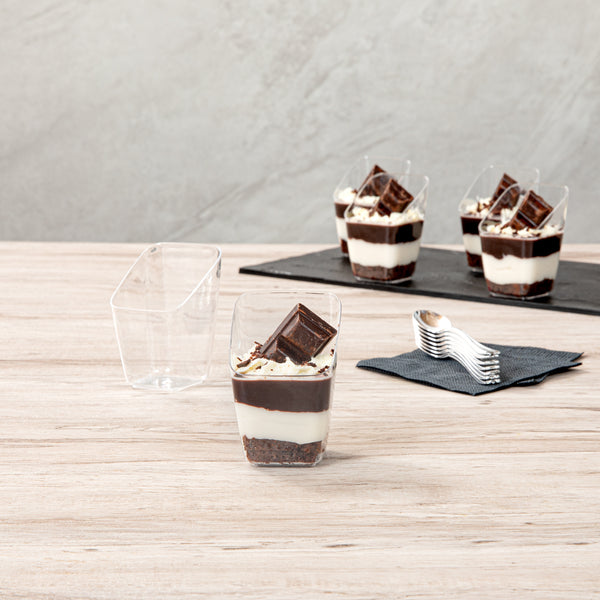 Present your desserts elegantly with our Mini Serve 2-ounce Square Clear Plastic Dessert Cups. These recyclable plastic dessert cups are made from sturdy PS plastic, ensuring they withstand even the busiest events. The modern slant design adds a touch of sophistication to every serving, making these clear dessert cups a perfect addition to any dessert table. Suitable for handling cold foods, these clear recyclable plastic dessert cups can perfectly showcase ice cream, mousse, or fruit salads. The clear finish of these dessert cups enhances the visual appeal of your desserts. These clear dessert cups are stackable and can be easily stored, maximizing your space. Measuring 2.5 inches in length by 2.5 inches in width by 3 inches in height, these 2-ounce dessert cups are compact yet provide adequate capacity for delectable treats. Sold in a 100 count box.