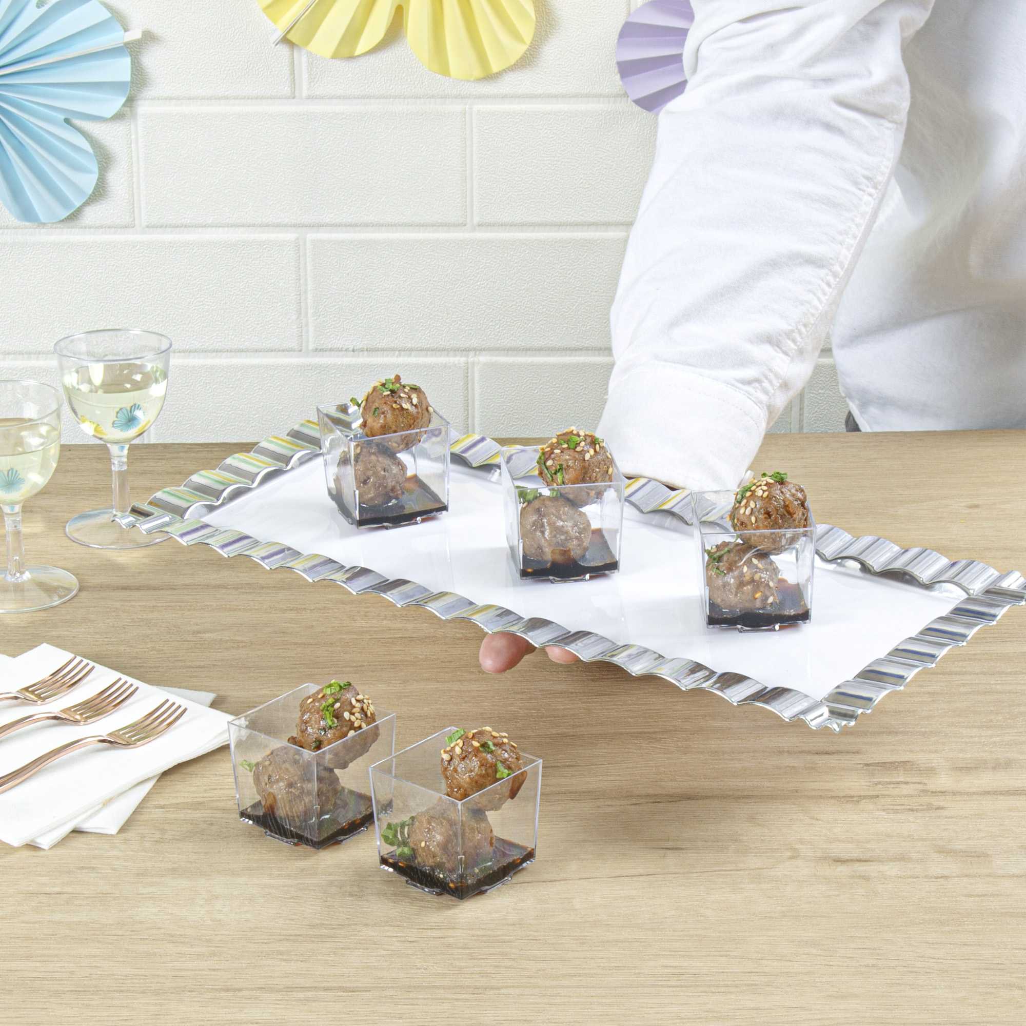Bring sophistication to your table with our Mini Serve 2-ounce Square Clear Plastic Quadrato cups. Constructed from plastic, these clear cups ensure durability and don't crack easily. The smooth rims of these plastic cups avoid unexpected scratches, providing a comfortable eating experience. Plus, the square and stackable design of these quadrato cups is space-efficient and ideal for large social gatherings. The clear look of these appetizer cups adds an elegant visual charm that suits any setting. With a capacity of 2 ounces, these light dessert cups are excellent for serving bite-sized appetizers, desserts, or drinks. Single-use and disposable, these recyclable square snack cups make the cleanup process simple and efficient. Each disposable plastic cup measures 1.75 inches in length by 1.75 inches in width by 1.5 inches in height, proving to be an ideal size for small servings. Shipped in a 100 count box.
