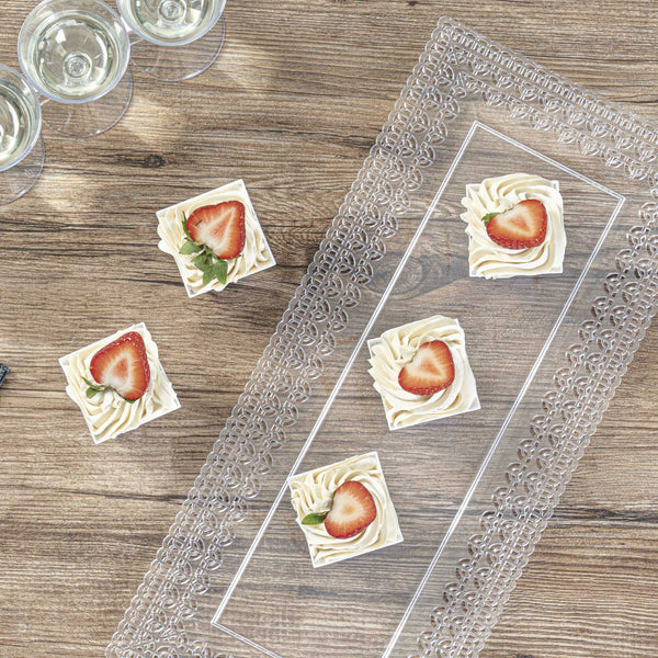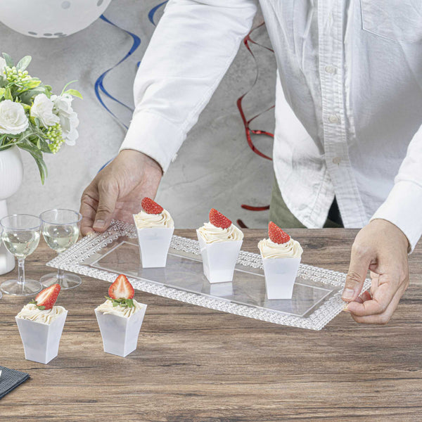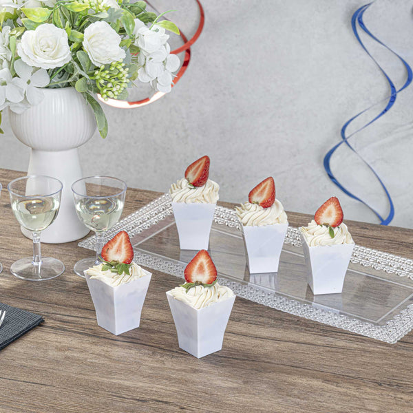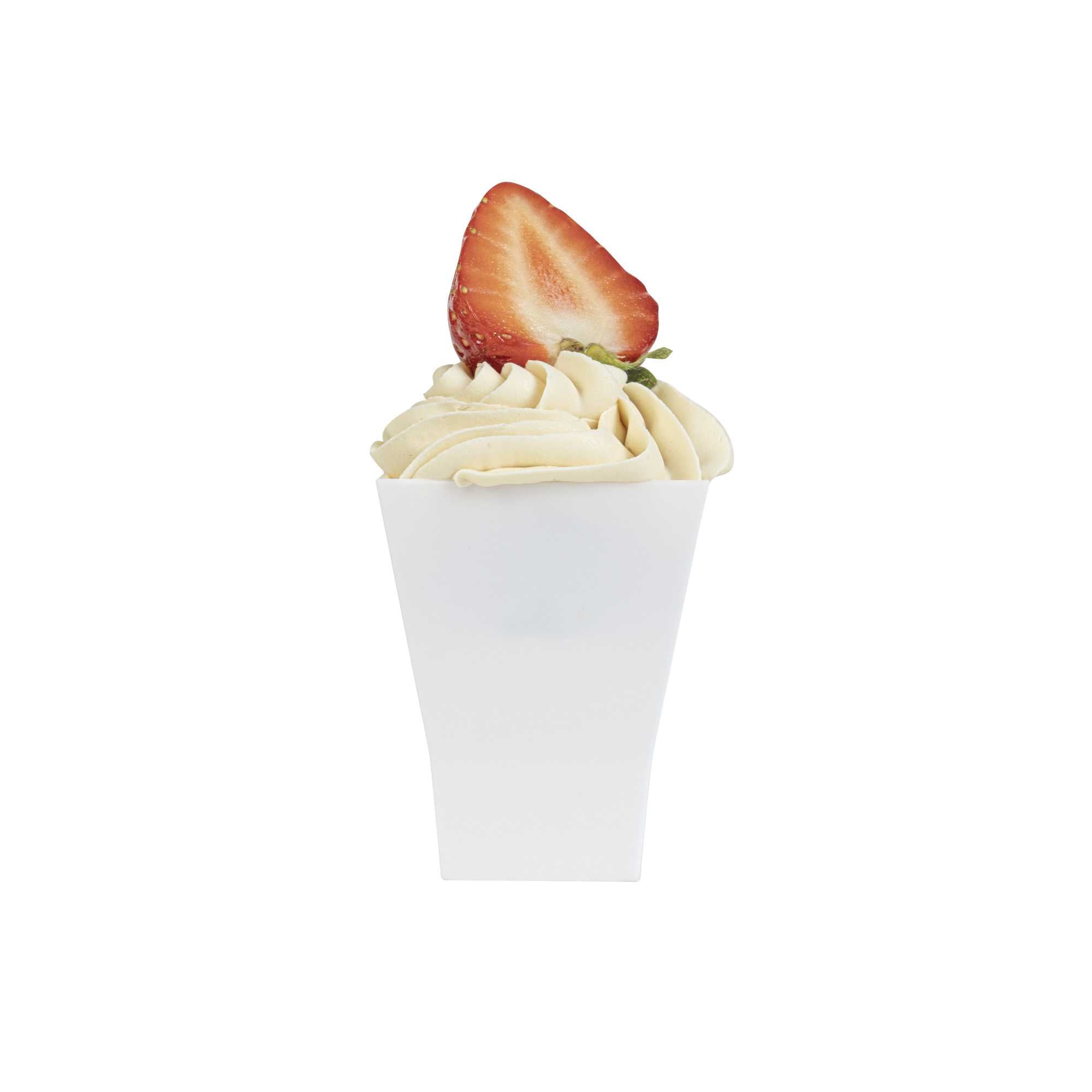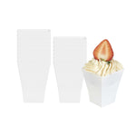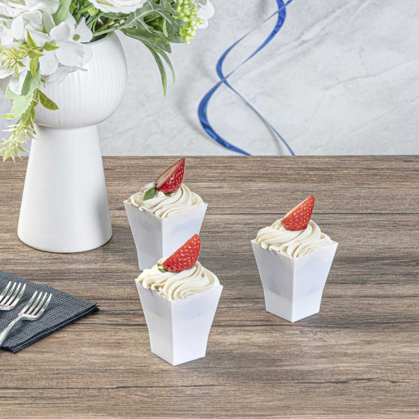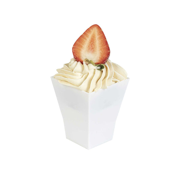 Our Mini Serve 2-ounce Square White Plastic Bonito Cups are perfect for elevating your culinary presentations. Showcasing a contemporary, tall design, these small disposable cups add a touch of sophistication to any event. Made of plastic material, these shooter cups offer a sustainable option for serving your tasty treats. With these mini dessert cups' sturdy construction, durability is ensured, as they resist chipping and breaking. These tiramisu cups have a white finish, gracefully containing the layers of your delectable desserts. Designed for easy cleaning, these disposable mini-plastic cups are well-suited for restaurants, buffets, or catering events. With a 2-ounce capacity, these fashionable plastic cups measure 1.75 inches in length, 1.75 inches in width, and 2.25 inches in height. Sold in a 100 count box.
