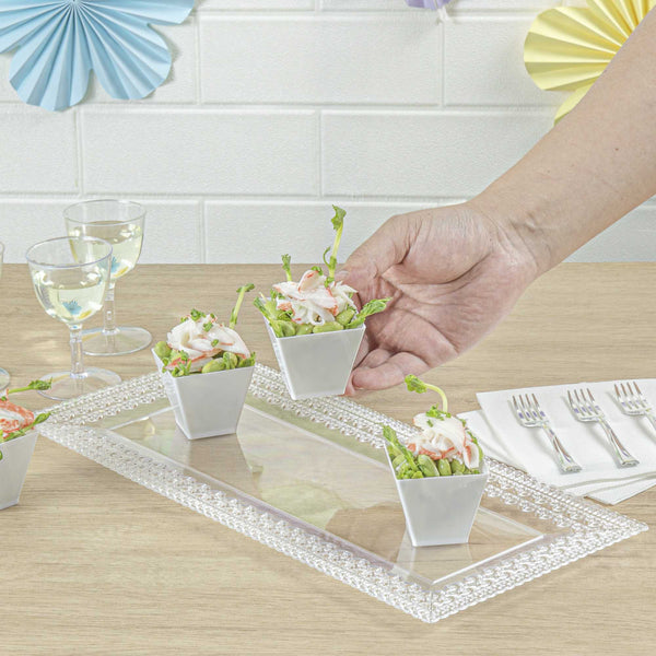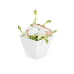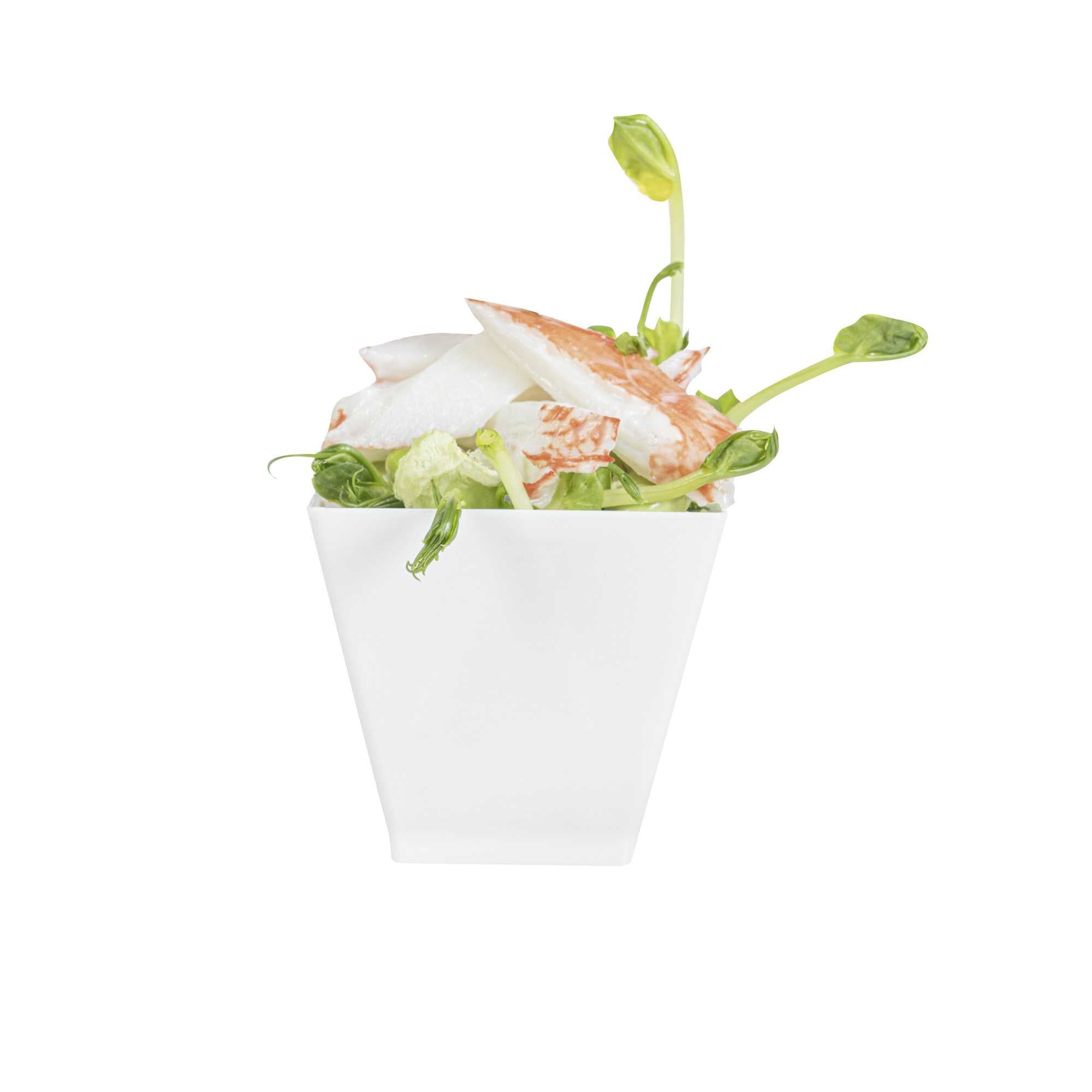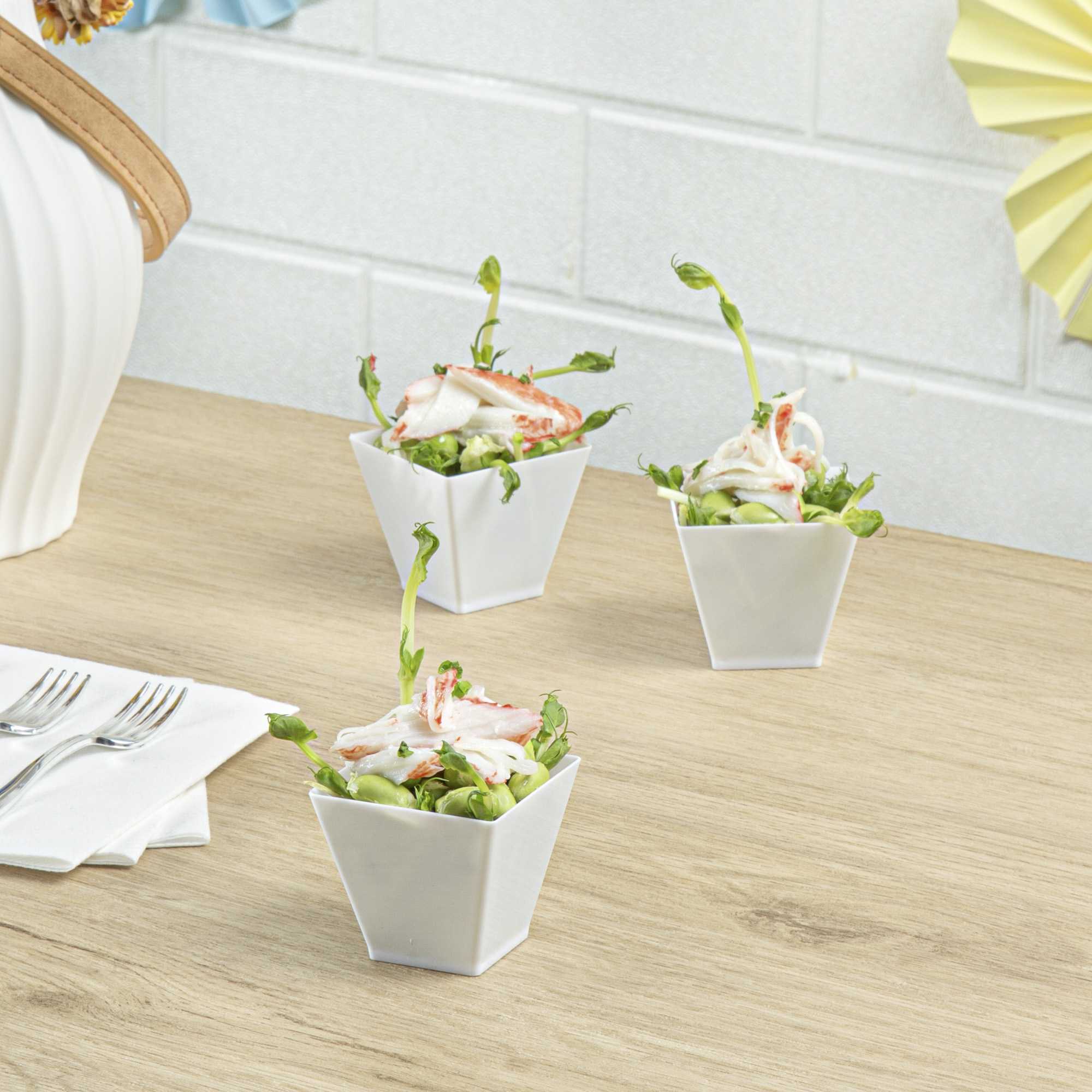 Enhance your culinary offerings with our Mini Serve 2-Ounce Square White Plastic Mini Kova Cups. Crafted from sturdy material, these mini plastic cups ensure a dependable performance on your special occasion. The smooth rim of these white plastic cups protects patrons from potential accident scratches, ensuring a pleasing eating encounter. Plus, the crisp white finish imparts a classic elegance to your presentation, making these plastic kova cups a suitable accessory for any function. Ideal for portioning desserts, appetizers, and drinks, these disposable mini cups impeccably showcase your small-portion culinary creations. The 2-ounce capacity of these plastic snack cups is the perfect size for bite-sized treats, and their single-use design ensures a quick and easy clean-up process. Pair these cups with our Mini Serve matching lids (SKU: RWP0305C) to protect the contents. Measuring 2 inches in length by 2 inches in width by 1.75 inches in height, these disposable kova cups are stackable. Sold in a 100 count box.