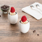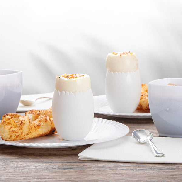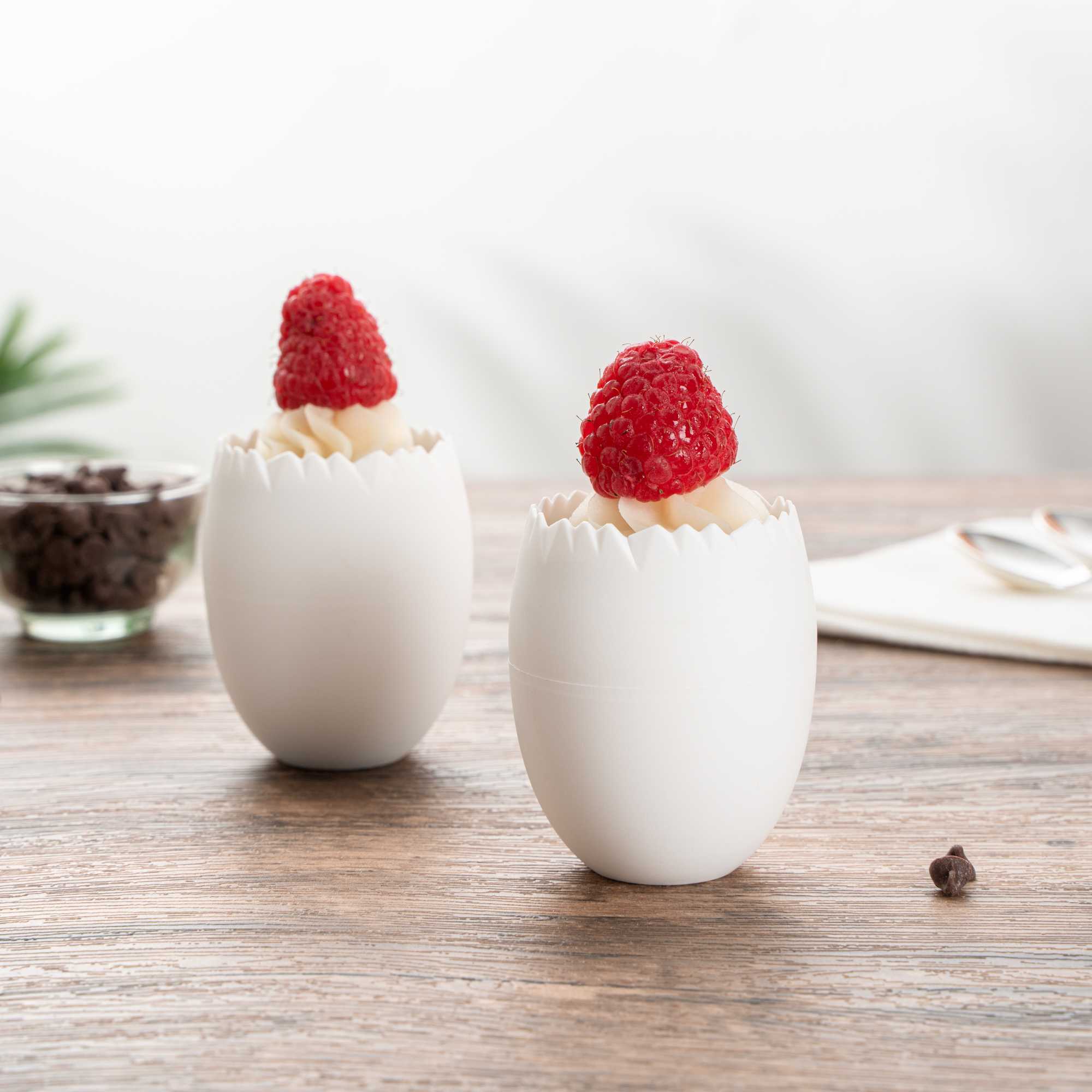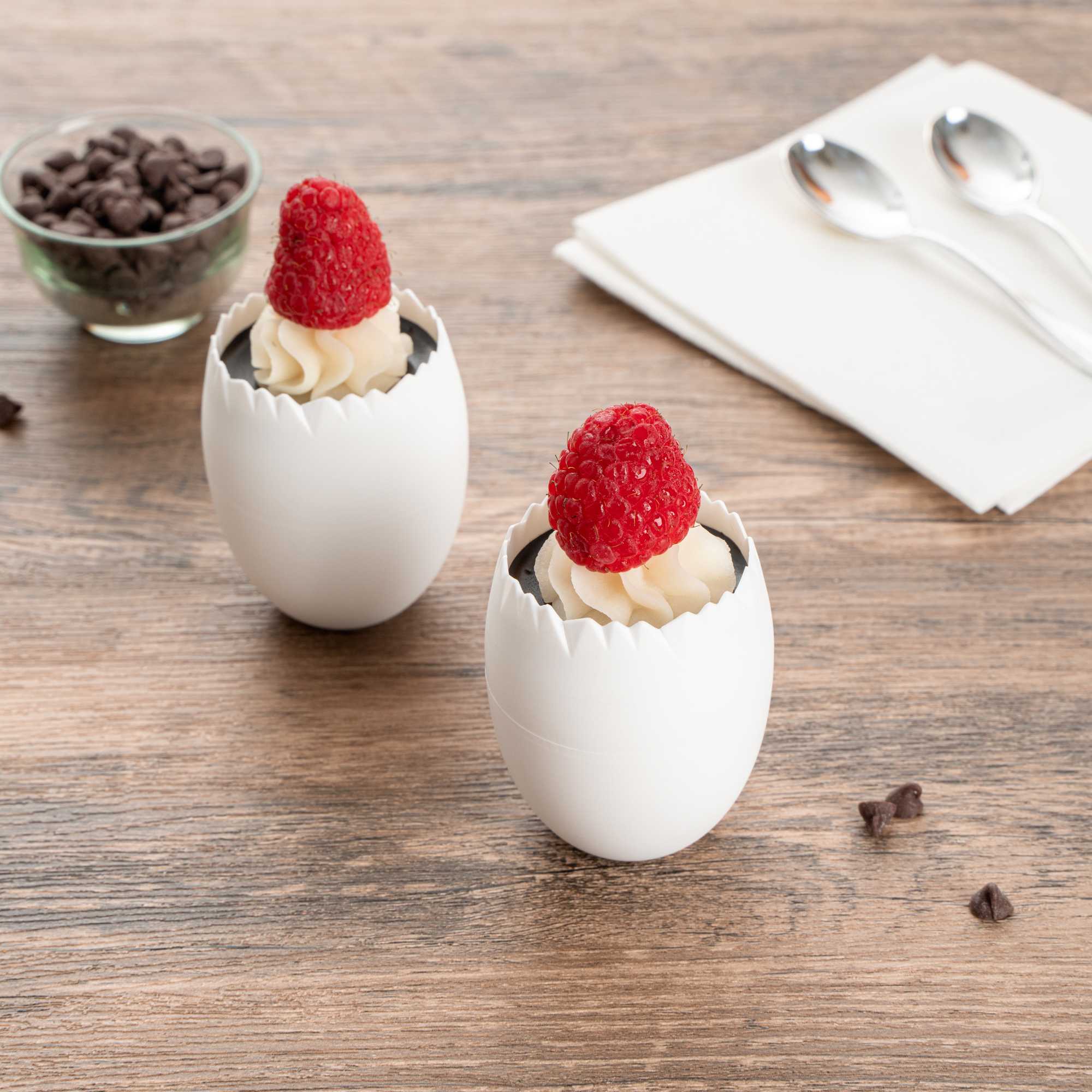 Present desserts with our Mini Serve 2-ounce White Plastic Cracked Uovo Cups. Crafted from high-quality plastic, these white cups are durable and ideal for serving cold food items at your restaurant. These dessert cups can hold up to 2 ounces and are ideal for serving small portions of your appetizers. The inventive cracked egg design of these appetizer cups makes for an imaginative way to serve desserts, appetizers, ice cream sundaes, and so much more. With a classic white finish, these disposable cups create an aesthetically pleasing food presentation. For an easy cleanup, these plastic cups are disposable. These decorative cups measure 1.75 inches in diameter by 2.25 inches in height and can hold up to 2 ounces. Sold in a 100 count box.