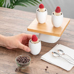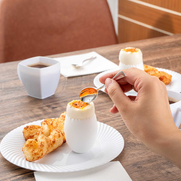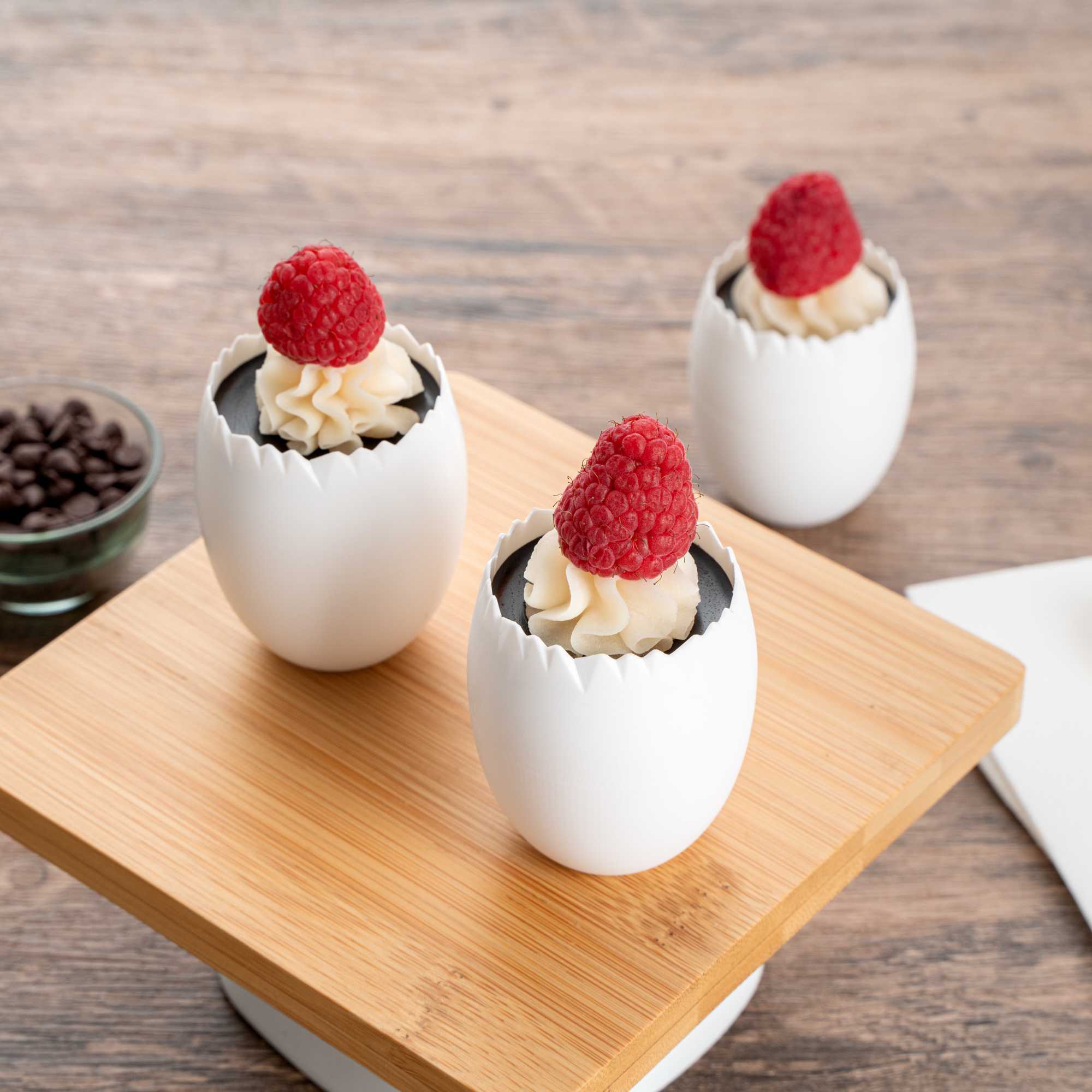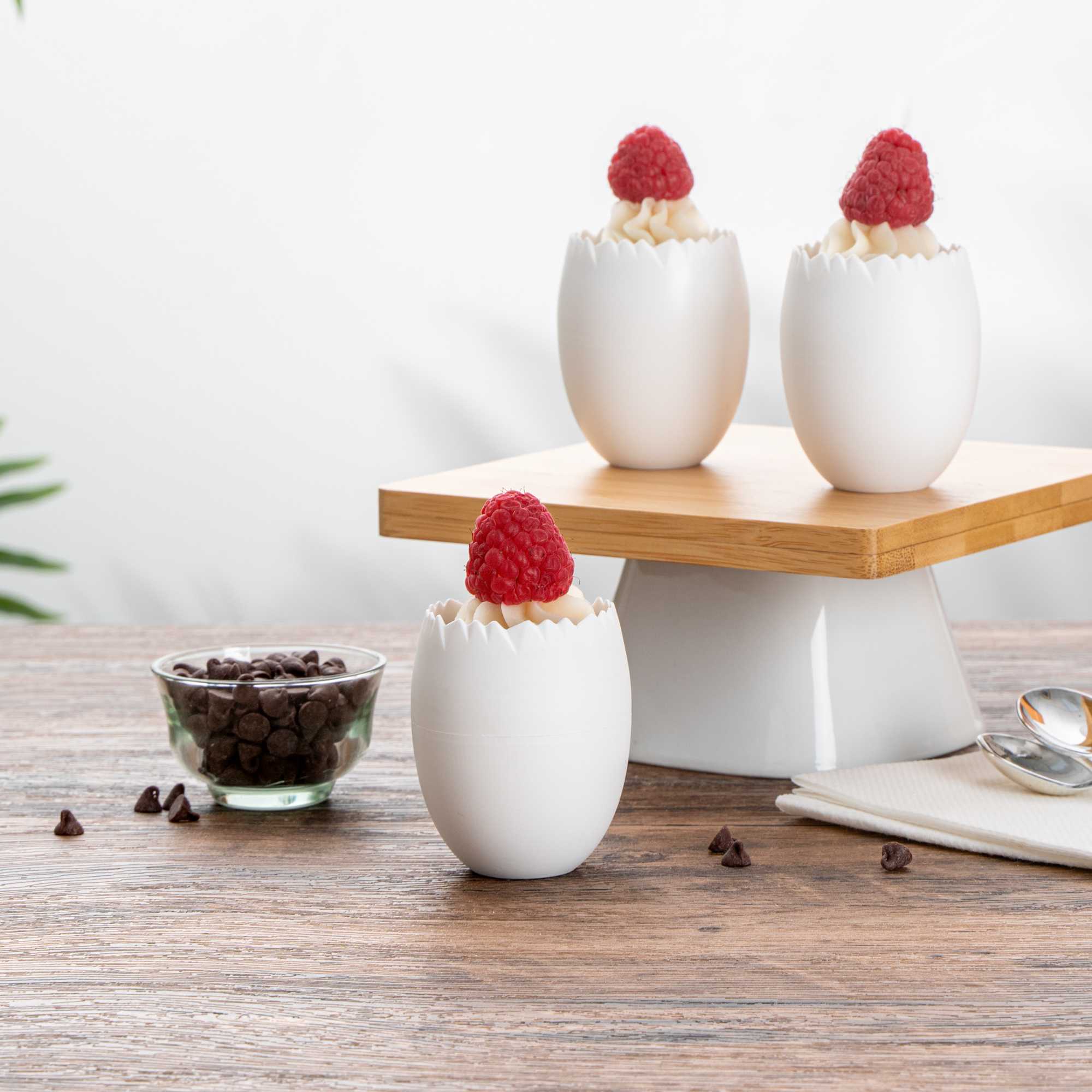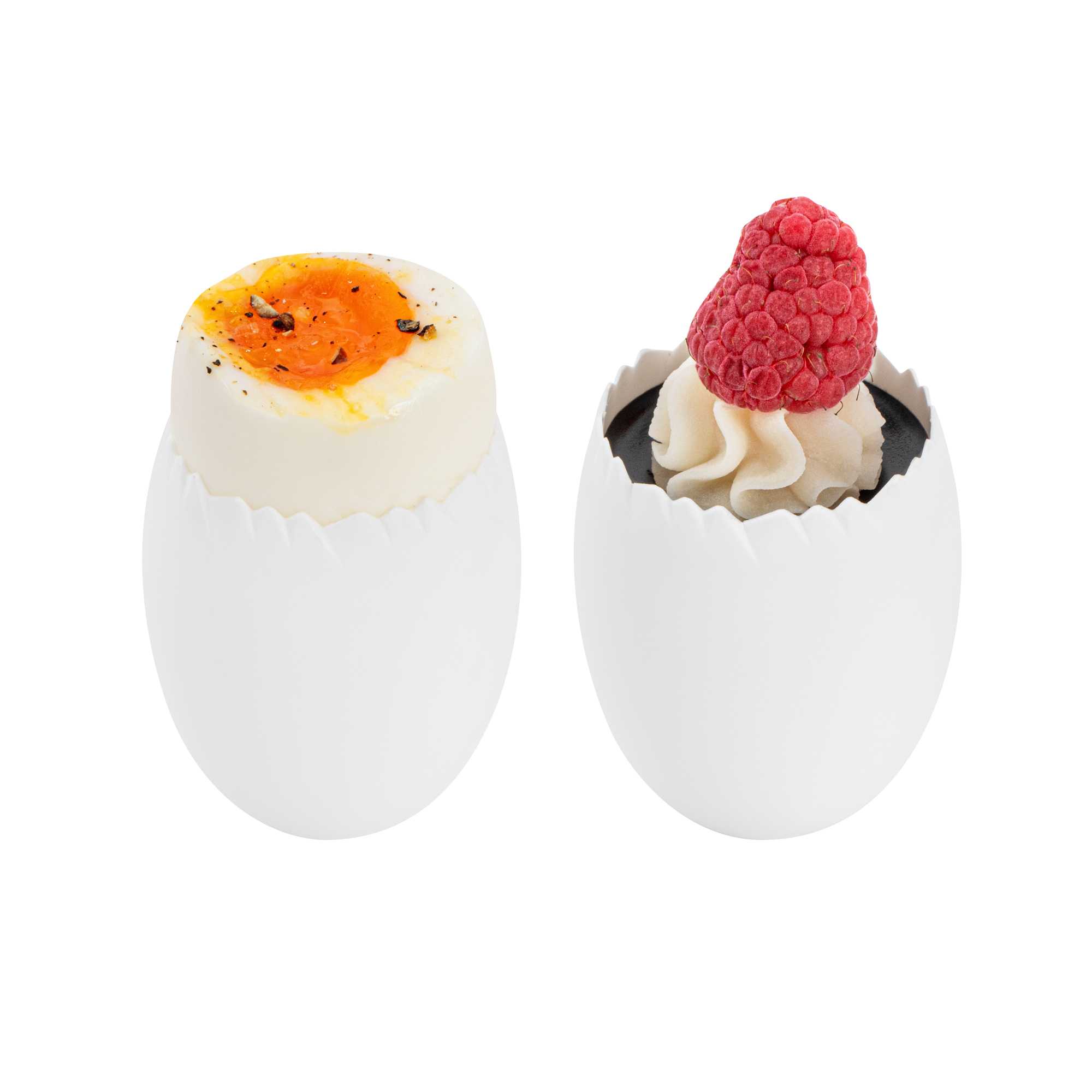 Present desserts with our Mini Serve 2-ounce White Plastic Cracked Uovo Cups. Crafted from high-quality plastic, these white cups are durable and ideal for serving cold food items at your restaurant. These dessert cups can hold up to 2 ounces and are ideal for serving small portions of your appetizers. The inventive cracked egg design of these appetizer cups makes for an imaginative way to serve desserts, appetizers, ice cream sundaes, and so much more. With a classic white finish, these disposable cups create an aesthetically pleasing food presentation. For an easy cleanup, these plastic cups are disposable. These decorative cups measure 1.75 inches in diameter by 2.25 inches in height and can hold up to 2 ounces. Sold in a 100 count box.