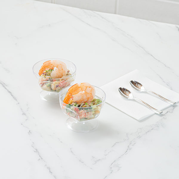 Elevate your dessert presentation with sturdy elegance. Mini Serve Mini Dessert Cups combine a footed base with a 3.03-inch by 3.03-inch by 2.17-inch design, ensuring stability and preventing tipping at events. Ideal for showcasing exquisite dessert shooters, these cups are crafted from durable plastic, making them perfect for outdoor gatherings where breakage is a concern. Their disposable nature streamlines cleanup, allowing your staff to maximize efficiency in bustling environments. These clear plastic dessert shot glasses are cold food friendly, enabling you to serve chilled treats with confidence. Enhance the visual appeal of your creations while maintaining operational ease. Sold in a 100 count box.