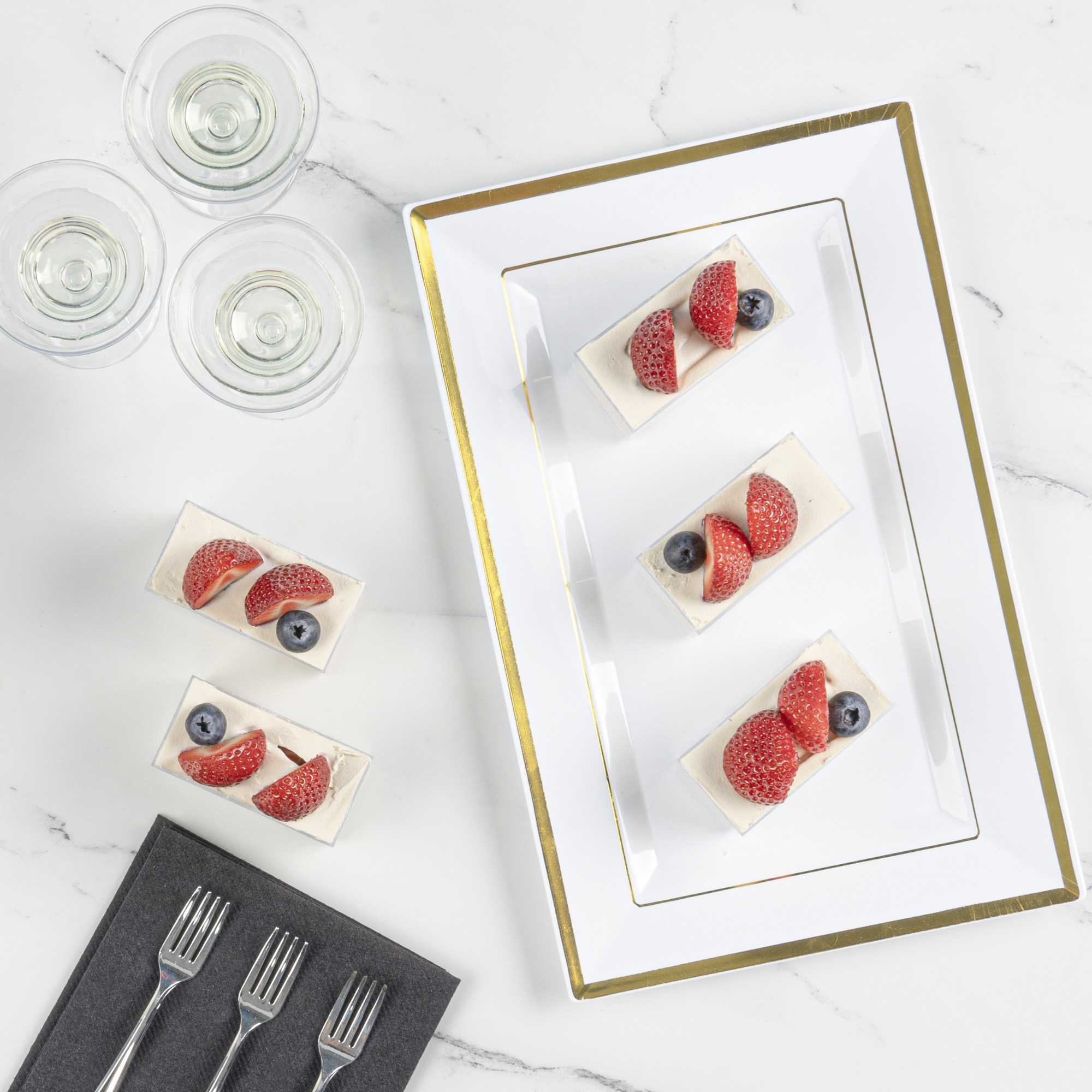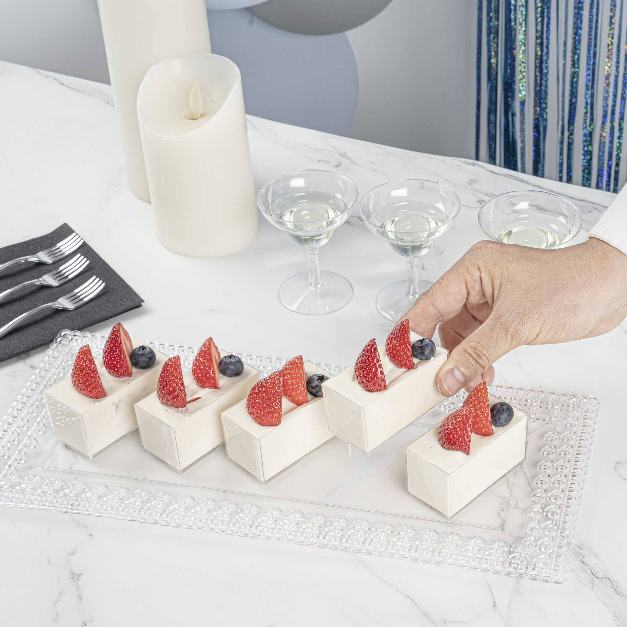 Create unique appetizer or dessert displays with our Mini Serve 3-ounce Rectangle Clear Plastic Dessert Cups. These rectangle cups are crafted from high-quality plastic and durable, allowing you to serve saucy or liquidy foods without worrying about messes. Specially designed to securely stack on top of one another, these clear cups can be placed in many different formations to build a truly impressive arrangement. Holding up to 3 ounces, these mousse cups are perfect for serving small portions of your signature dishes. These dessert cups feature a modern, rectangular shape to elevate your food presentation. The crystal clear finish of these parfait cups offers an unobstructed view of the foods inside. These plastic cups are disposable for easy cleanup. Each appetizer cup measures 2.75 inches in length by 1.5 inches in width by 1.5 inches in height and can hold up to 3 ounces. Sold in a 20 count box.