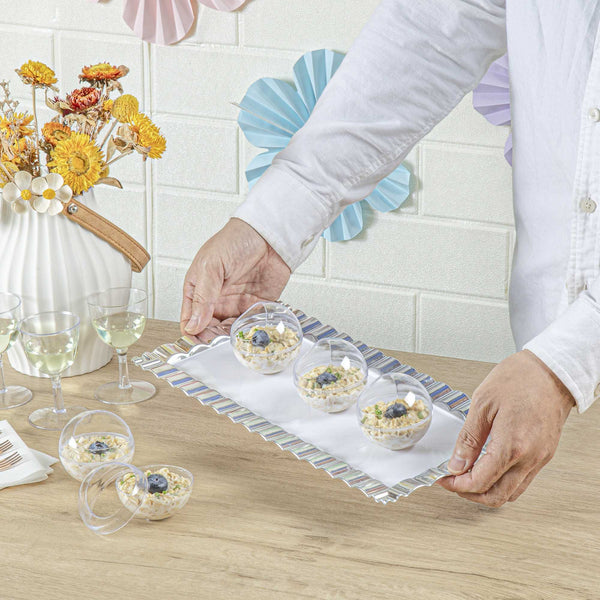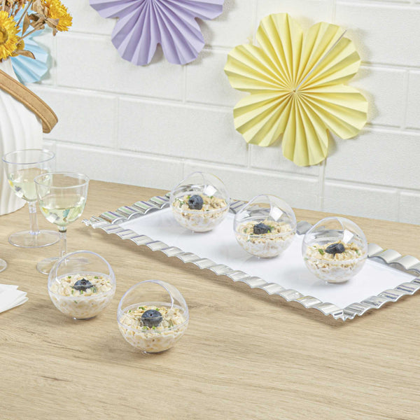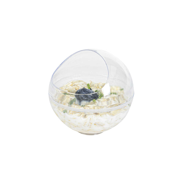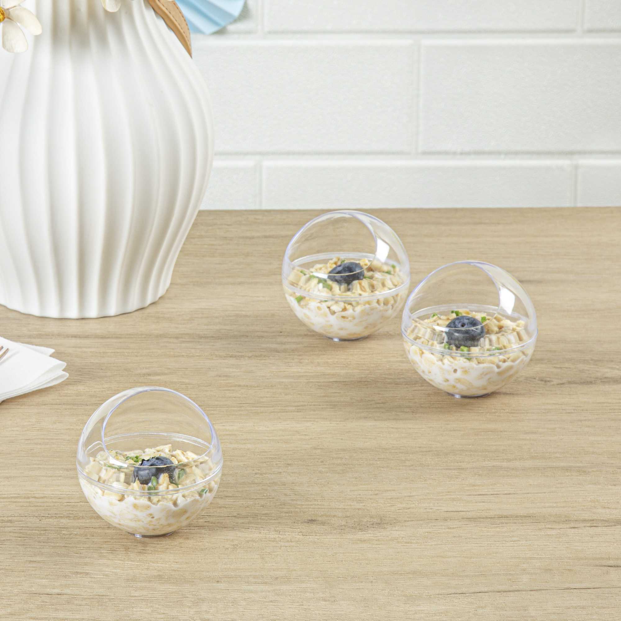 Our Mini Serve Mini Serve 3-ounce Round Clear Plastic Balloon Bowls create a unique presentation for layered desserts or fruit parfaits. These clear dessert cups have a globe shape that allows you to create visually stunning dessert presentations. The premium plastic construction of these mini dessert cups ensures durability for frequent use and handling. As disposable dessert cups, these round dessert cups can be used once and discarded to save on cleanup time. The two-piece design of these circular dessert bowls conserves storage space until ready for use. These 3-ounce dessert bowls have the ideal capacity for individually portioned desserts, and their lightweight, sturdy build allows for easy transport. Measuring 2.5 inches in diameter by 2.5 inches in height, these clear dessert cups fit comfortably in the hand while showcasing your culinary creations. Sold in a 10 count box.