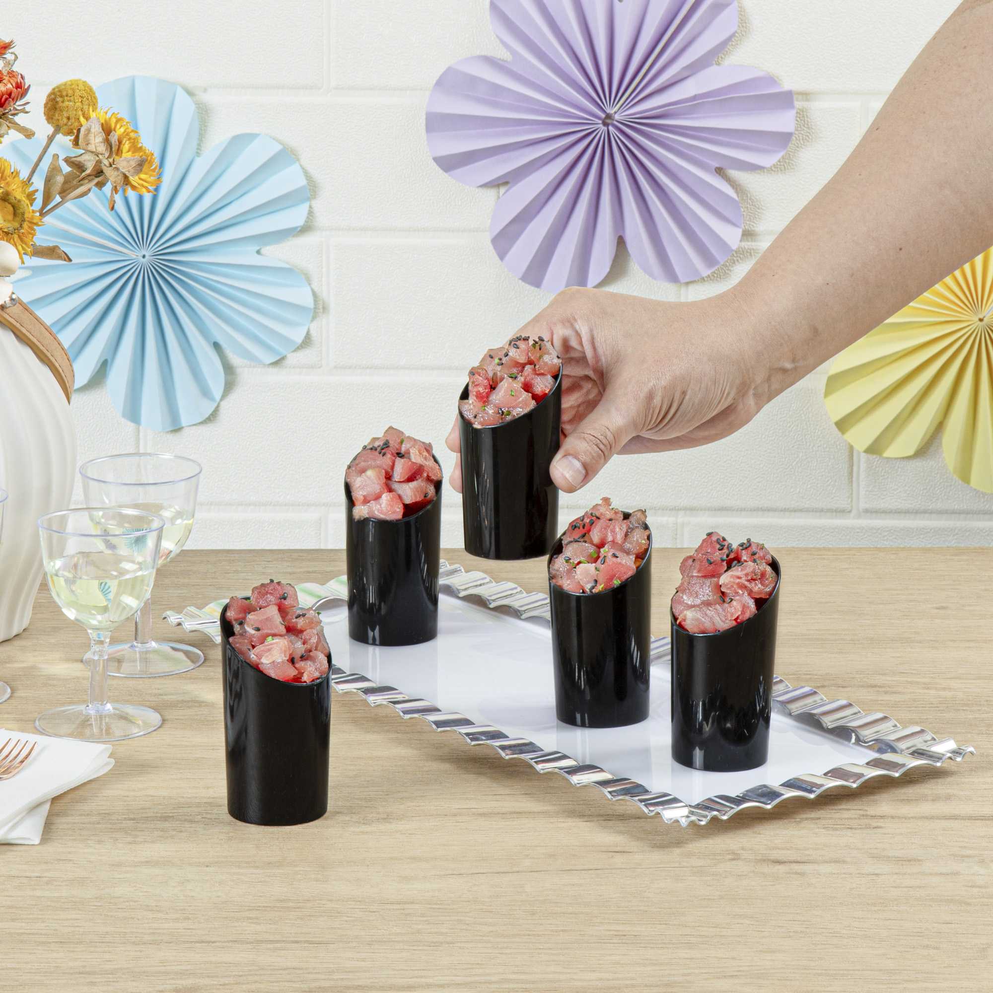 - Black finish provides an elegant backdrop to present drinks and appetizers