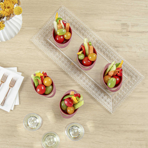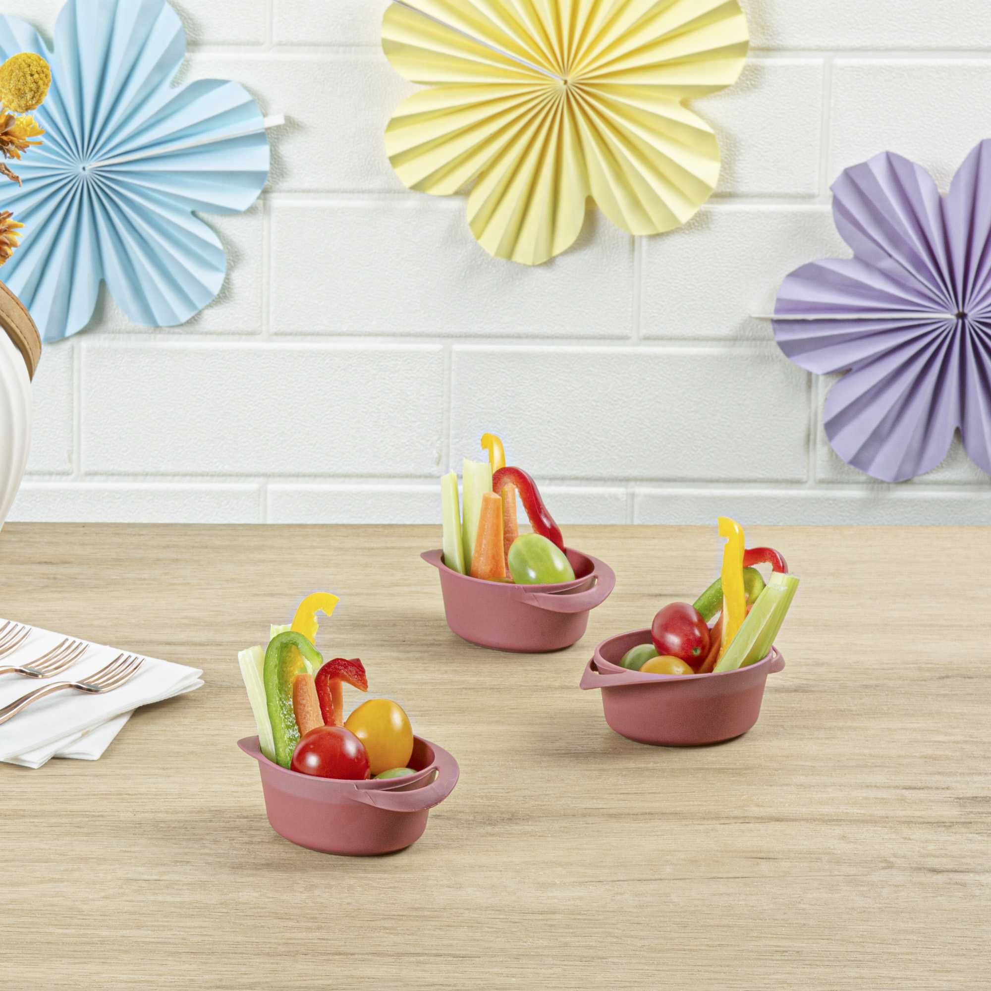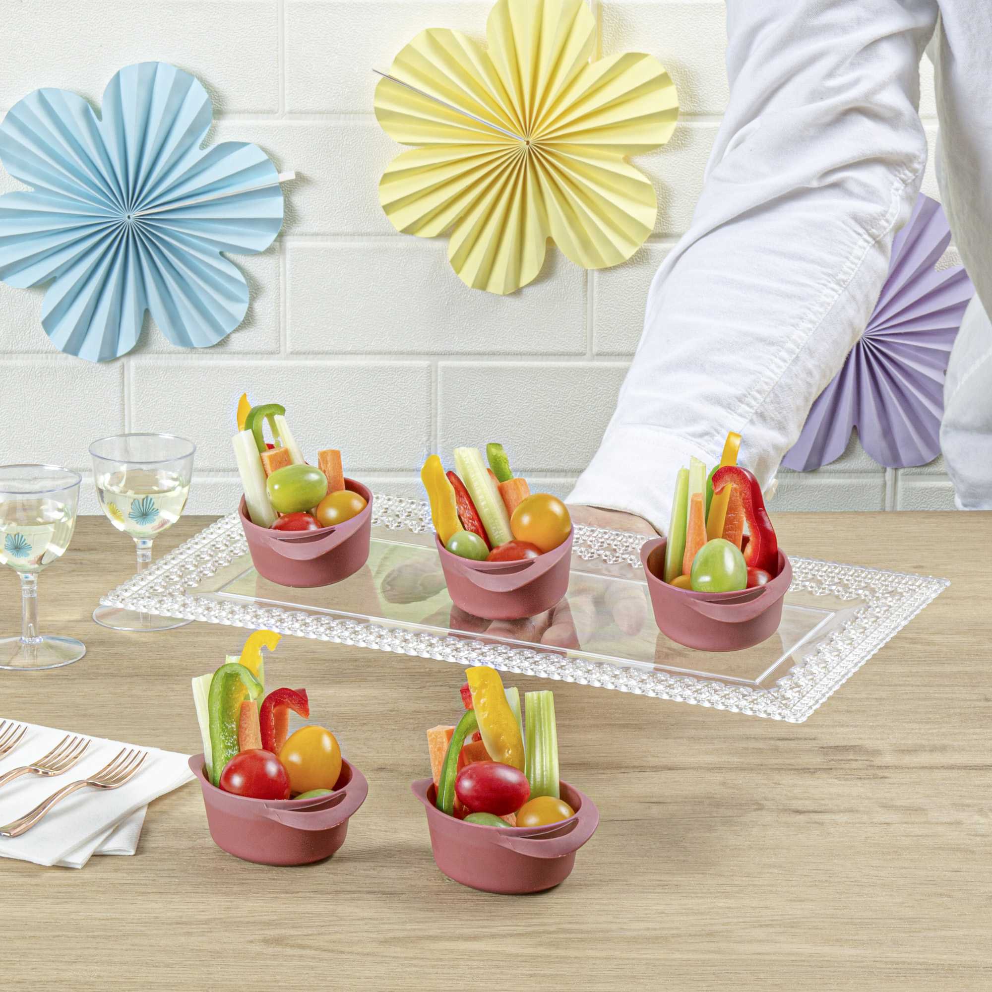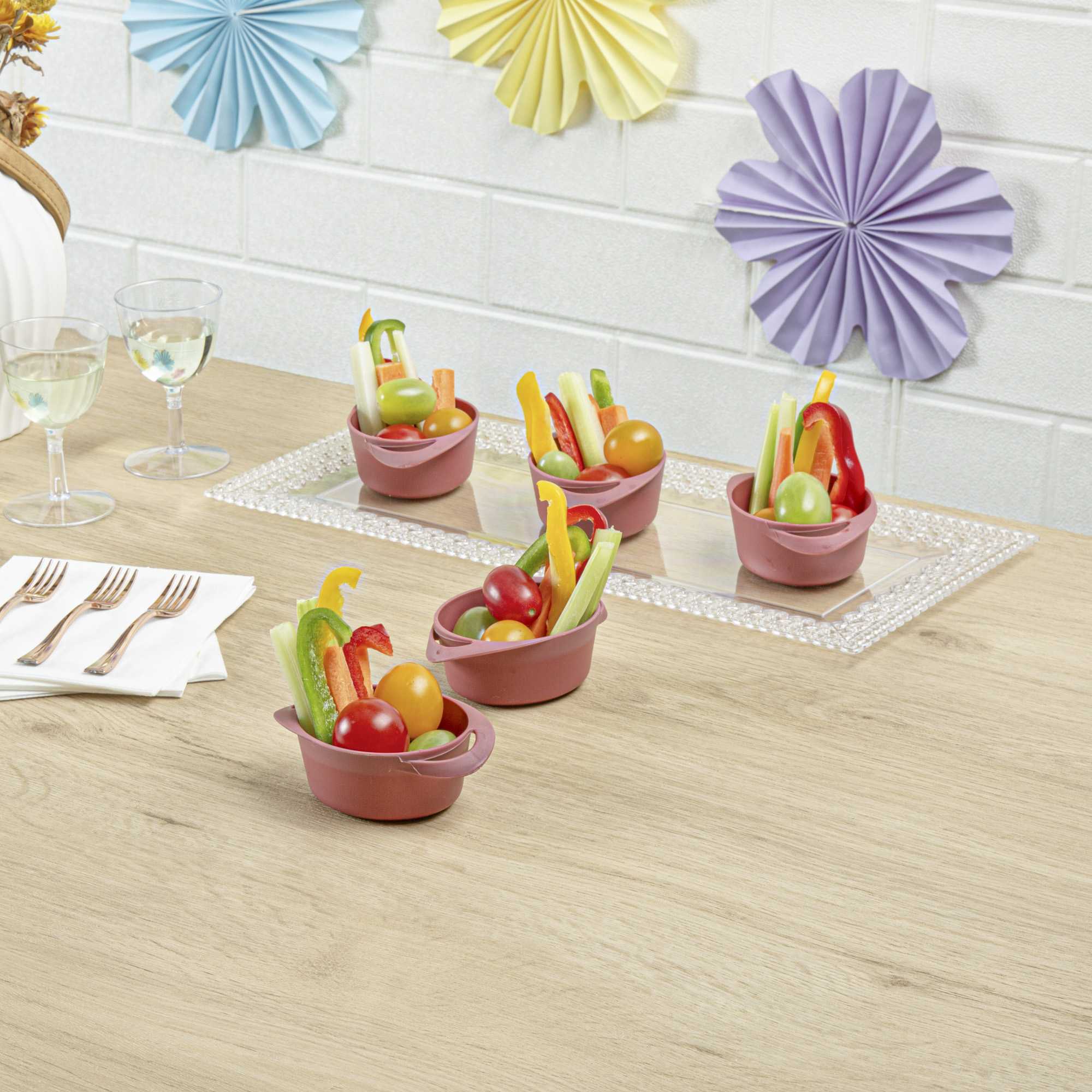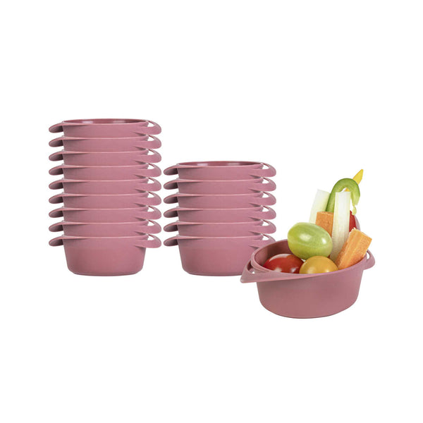 Provide an elegant solution for serving appetizers with our Mini Serve 3-ounce Round Red Plastic Mini Infinity Pots. These sleek plastic bowls feature elegant looping handles for easy transport. The deep construction of these plastic bowls with handles allows for generous portions, perfect for catering events. Made from recyclable plastic, these red plastic appetizer bowls are an eco-friendly choice. These disposable plastic deep bowls have a trendy and modern aesthetic that will impress guests. Sturdy yet lightweight, these 3 ounce plastic bowls are ideal for passing hors d'oeuvres. The infinity loop design and red finish of these plastic bowls gives a stylish touch to any tablescape. Measuring 2.5 inches in diameter and 2 inches in height, these plastic bowls hold 3 ounces for perfectly sized individual portions. Sold in a 100 count box.