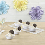 Our Mini Serve Mini Serve 3-ounce Round White Plastic Mini Infinity Pots are an ideal solution for serving appetizers or snacks. With elegant looping handles, these deep disposable plastic bowls provide an easy way for guests to carry their appetizer portions. The trendy and modern aesthetic of these sturdy yet recyclable plastic bowls will impress your guests. For mess-free dining, the deep construction of these plastic appetizer bowls contains sauces and liquids. Lightweight and portable, these plastic bowls with handles allow for quick and easy transport between kitchen and table. These disposable plastic deep bowls can also be used for dips, nuts or candies and easily be discarded after use. Measuring 2.5 inches in diameter by 1.25 inches in height to hold a generous 3 ounce portion, these plastic bowls maximize your table space. Sold in a 100 count box.
