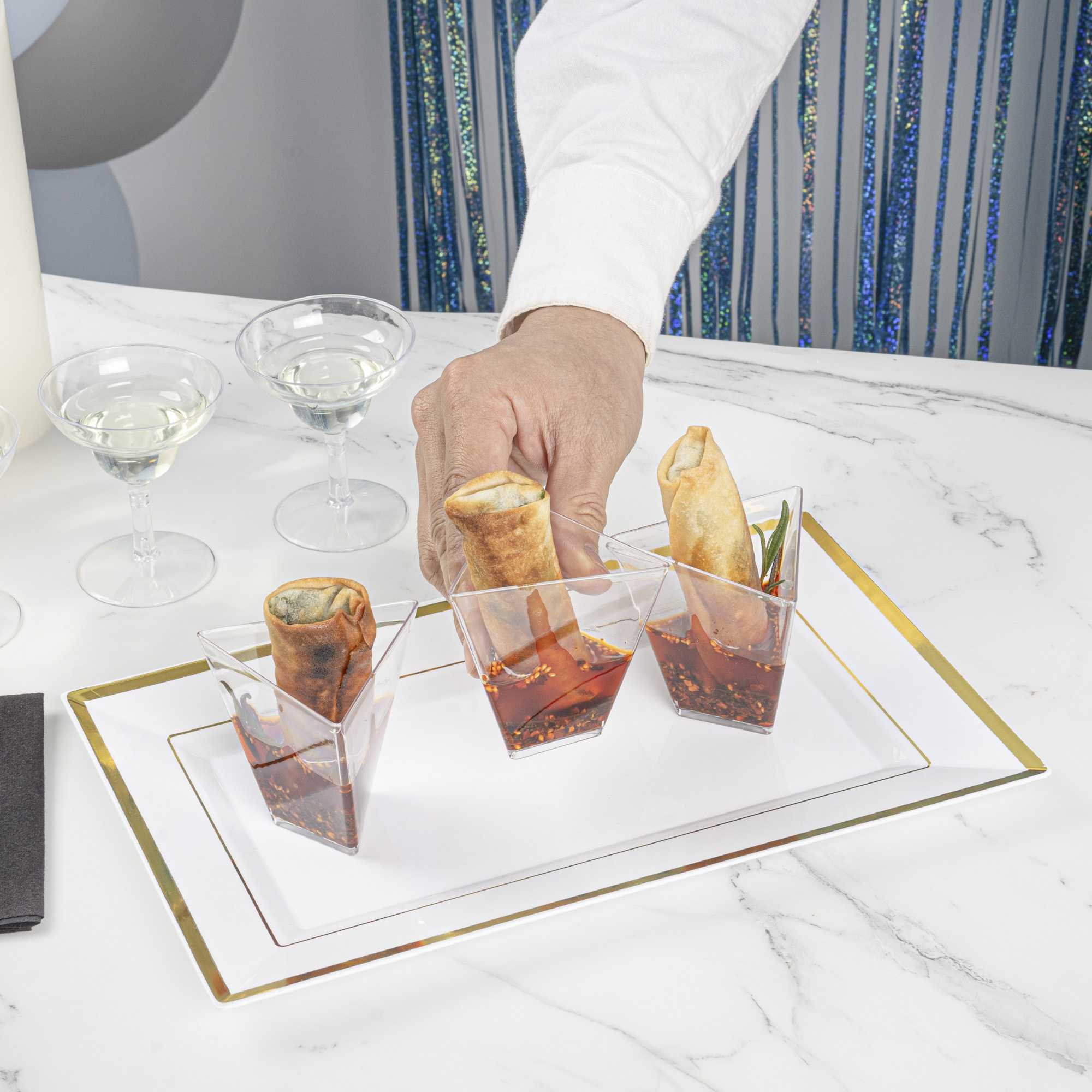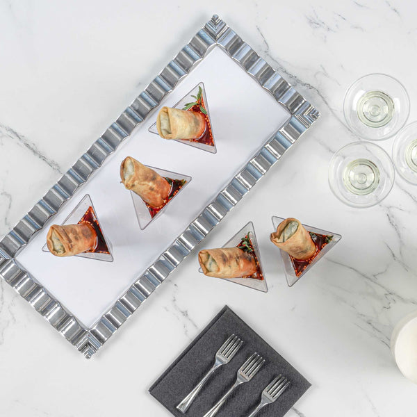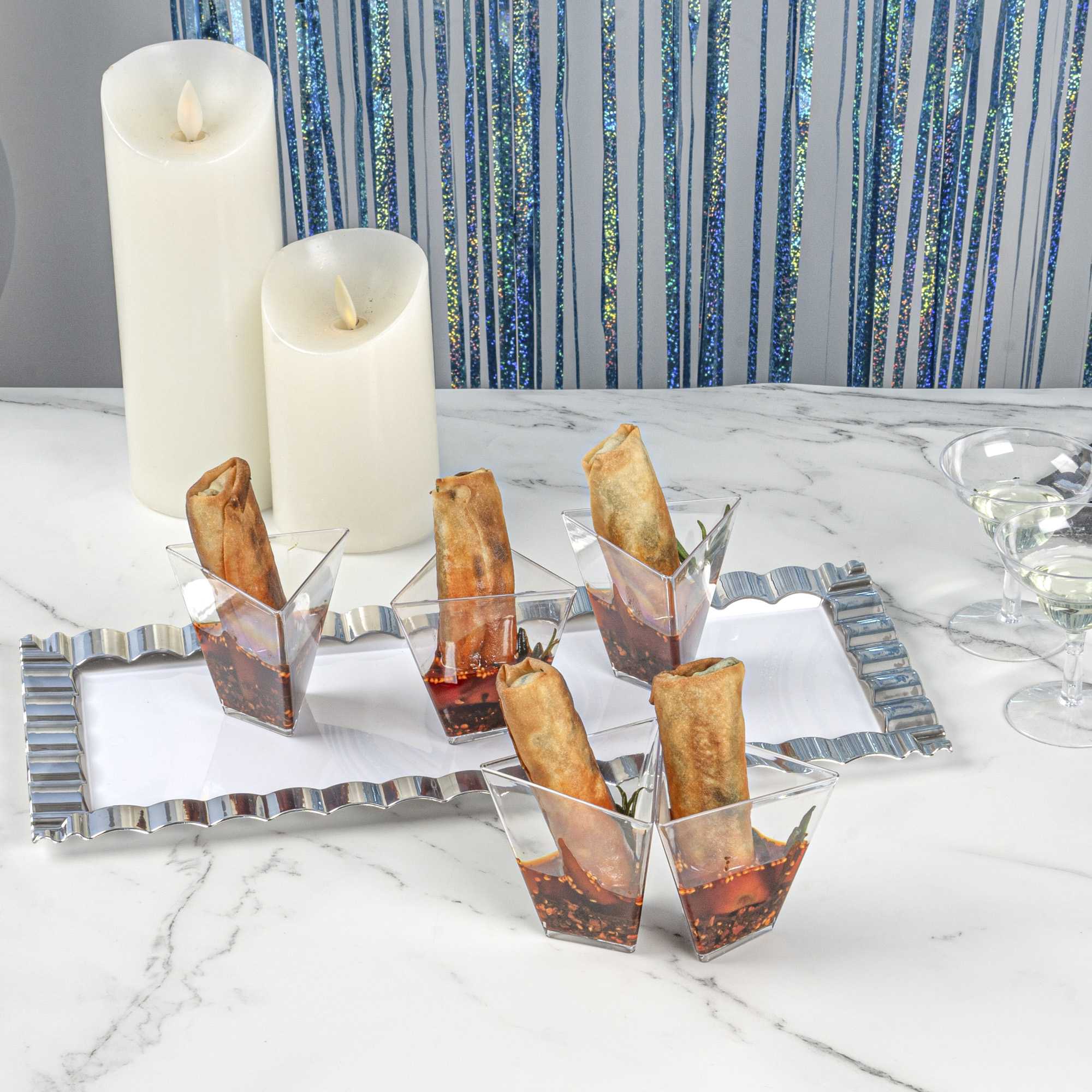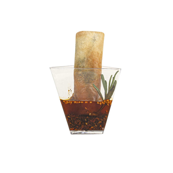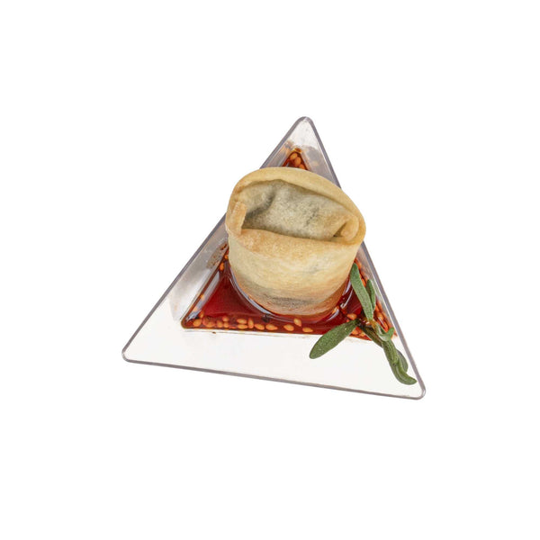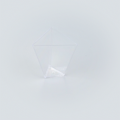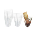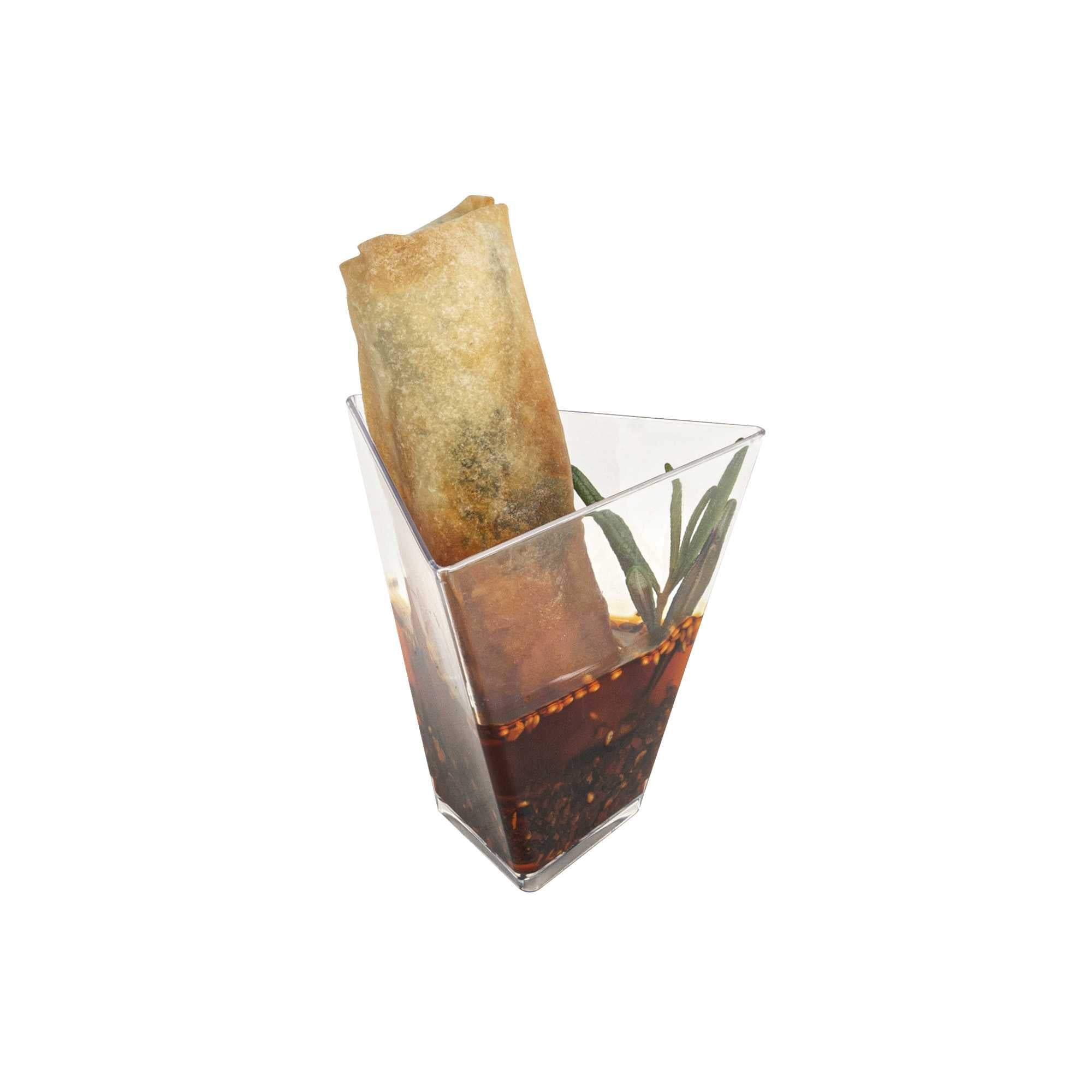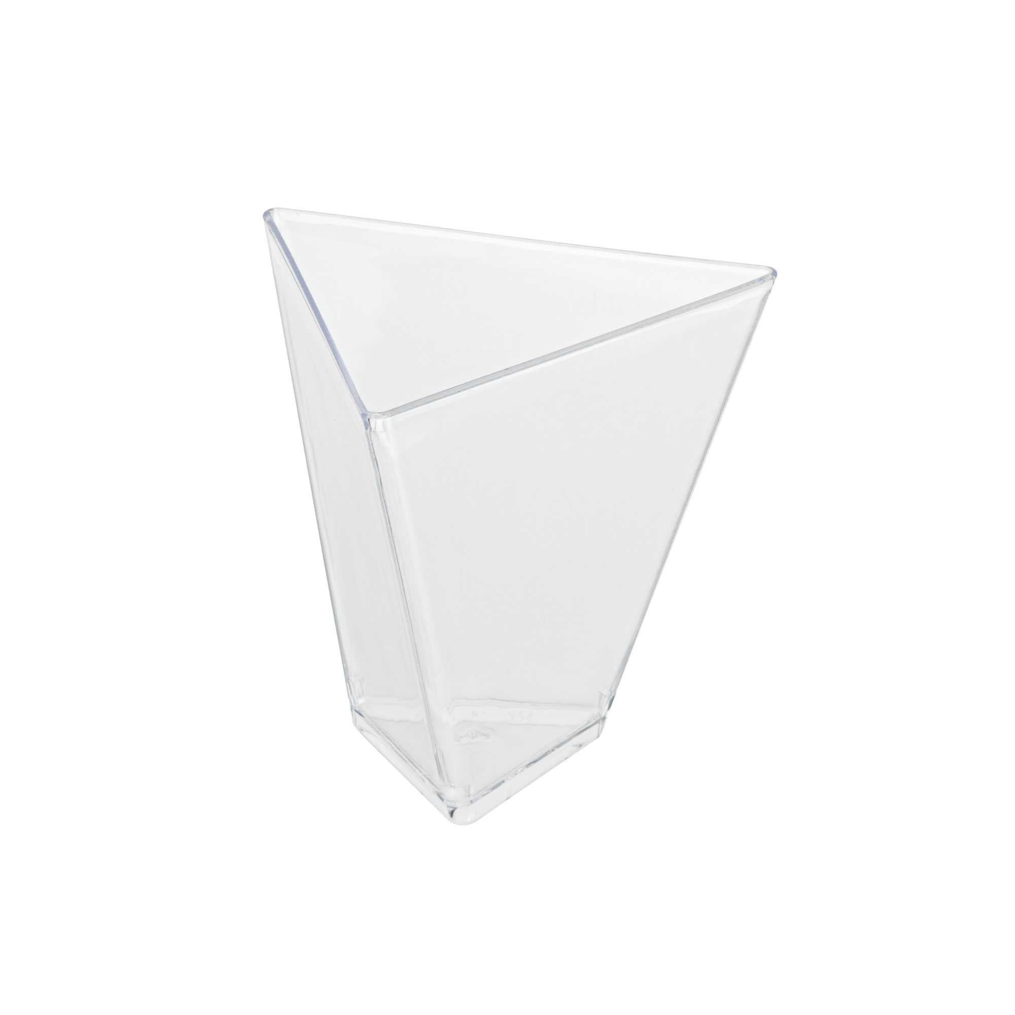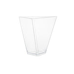Serve up mouthwatering treats with our Mini Serve 4-ounce Clear Plastic Torcente Dessert Cups. Made from high-quality plastic, these dessert cups are robust and well-suited for a broad spectrum of wet, dry, and cool dishes. Designed to hold up to 4 ounces, these disposable cups are excellent for portioning out individual servings of desserts and starters. These clear plastic cups boast a unique triangular design that adds a modern touch to any bite-sized offering. The clear finish of these plastic dessert cups gives a suave edge to your food presentation while showcasing the delightful contents inside. These clear cups are conveniently disposable, making the cleaning process a breeze. Each appetizer cup measures 3 inches in length by 2.5 inches in width by 2.75 inches in height and has a capacity of 4 ounces. Shipped in a 25 count box.